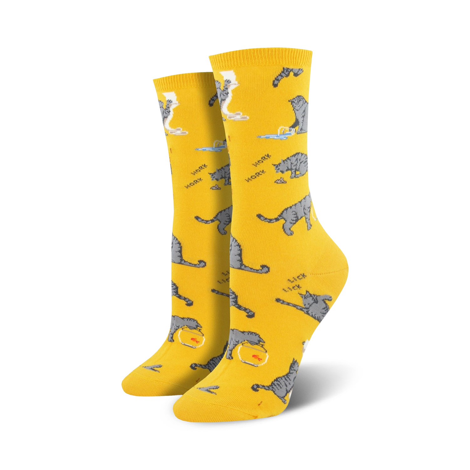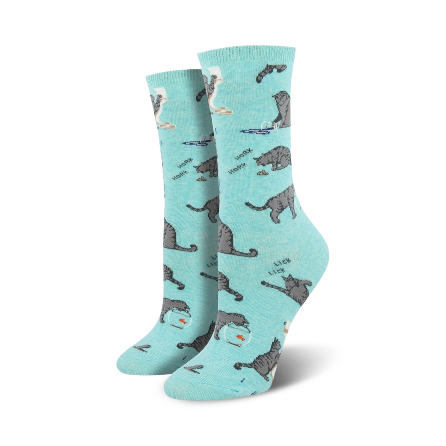 Crew-length Cativities socks! Get a load of these cool cat socks featuring gray feline pals in various hilarious poses like drinking from a bowl, playing with yarn, and grooming themselves. Keep your paws cozy and stylish while rocking these fun cat-patterned socks.