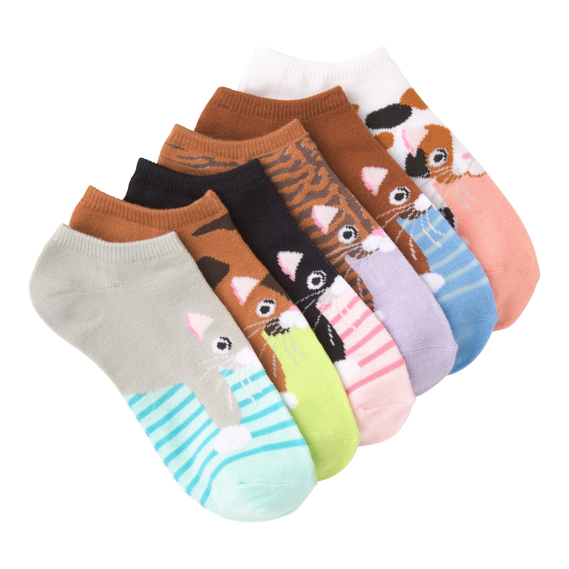 Six pairs of ankle socks featuring adorable cat faces. The visible socks show a variety of cute cats in different colors and styles. Some cats have stripes, others are solid colors, and each sock has a unique design. The colors shown are a mix of pastels- like light green and lavender- and warmer tones like brown and orange. The cats are drawn in a simple, charming style. These socks are perfect for adding a playful touch to your everyday look.