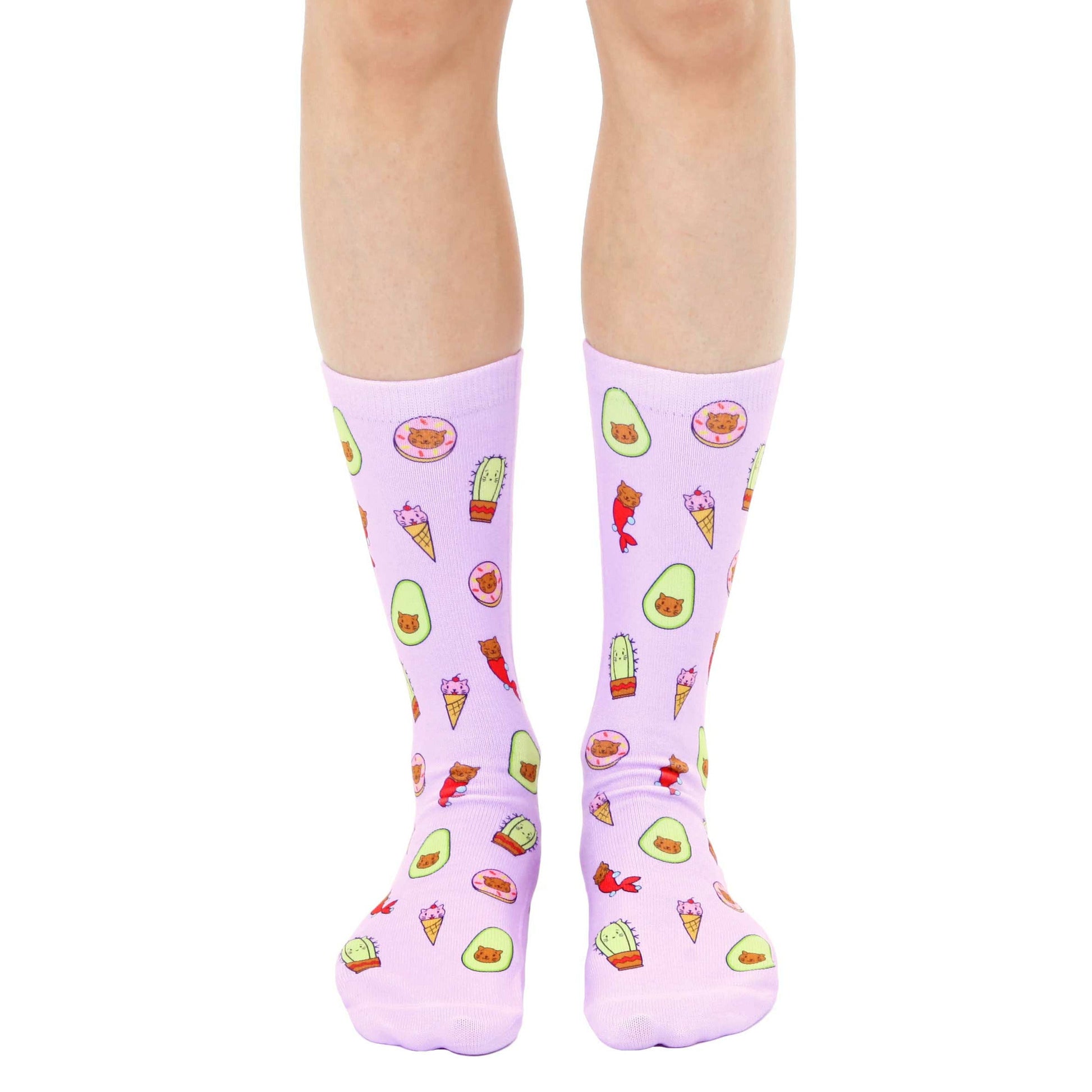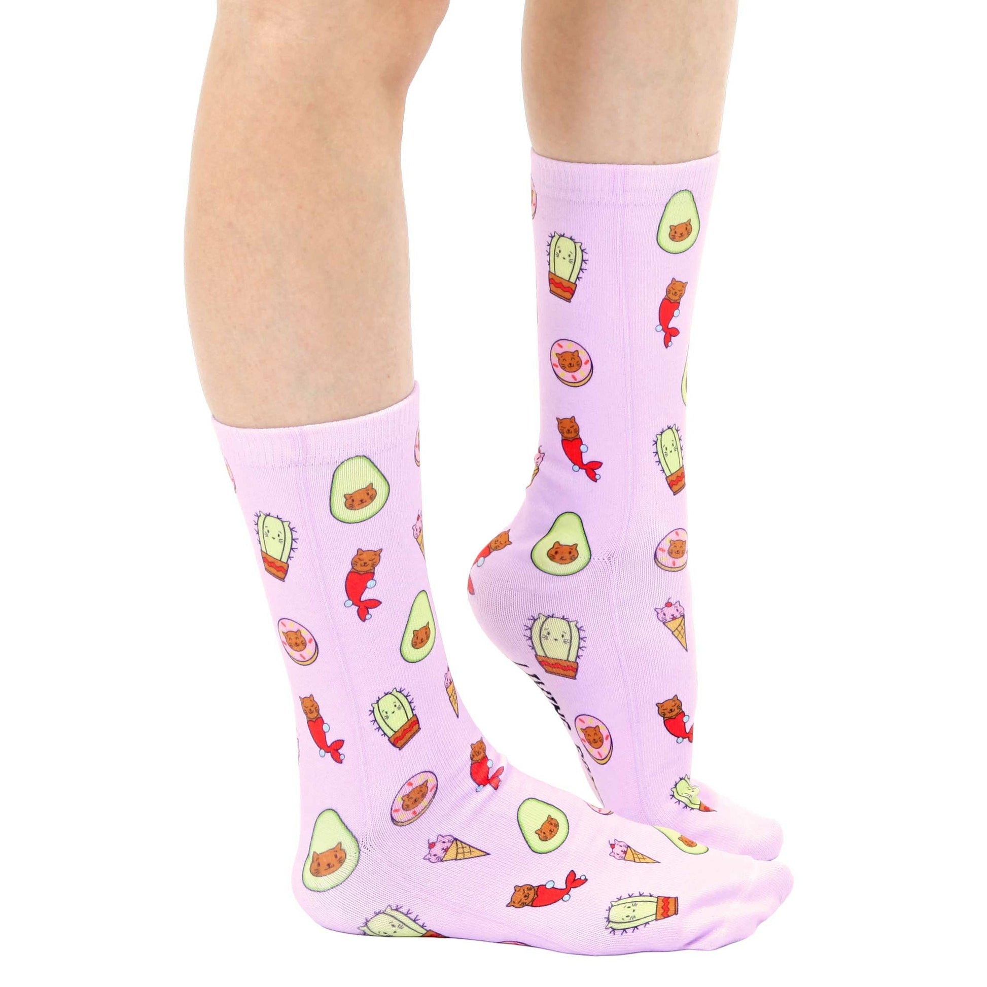 Enter the world of Cats As Things novelty socks where pink and a parade of purr-fect kitties collide in cartoon-like fashion. From the depths of the ocean to the land of make-believe, these socks have it all. Let your feet join the cat-querade with seafaring felines, scrumptious snack-inspired cuties, and a cactus sporting attitude. Each pair of these crew-length socks is a reminder that cats and creativity are the purr-fect pair.