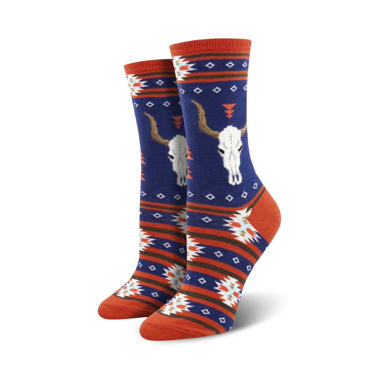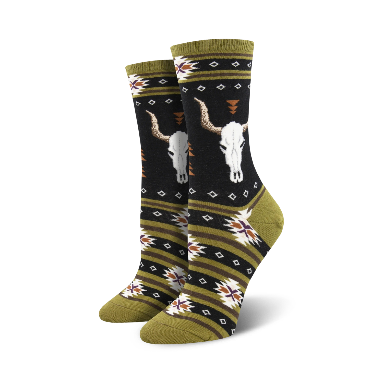 Channel your inner cowgirl or cowboy with these Cattle Call socks. The black, olive green, brown, and cream colors are a nod to the vast vistas of the Wild West, while the geometric patterns and steer skull motifs give them a playful, whimsical twist. In these crew length socks, you'll be rootin', tootin', and boot scootin your way through your day with a smile on your face.