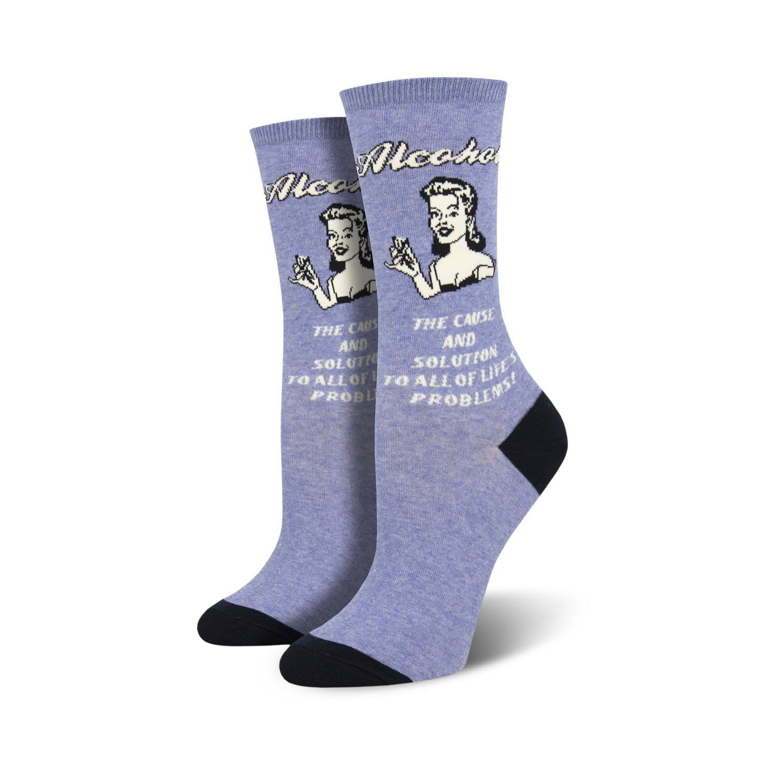 Looking for a fun and witty way to celebrate your appreciation for the one true elixir of life? Look no further than our Cause and Solution Women's Crew Socks. These socks feature a vibrant blue background with the phrase "Alcohol...The Cause and Solution to All of Life's Problems" and a black and white illustration of a woman holding a martini glass. They'll become your new favorite drinking companion for happy hour, a night out on the town, or just a quiet night in. Because let's face it, alcohol is often both the root of our problems and our trusted solution. And with their quality material and comfy fit, they'll make your feet happy too.