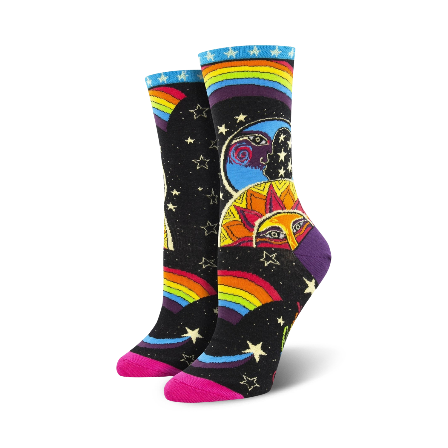 Imagine strutting around the cosmos with socks that sprinkle rainbows, stars, moons, and suns across your toes. "Celestial Joy" socks are the perfect accessory for cosmic adventurers who want to add a touch of interstellar whimsy to their wardrobe. These black crew socks for women are an explosion of celestial delights.