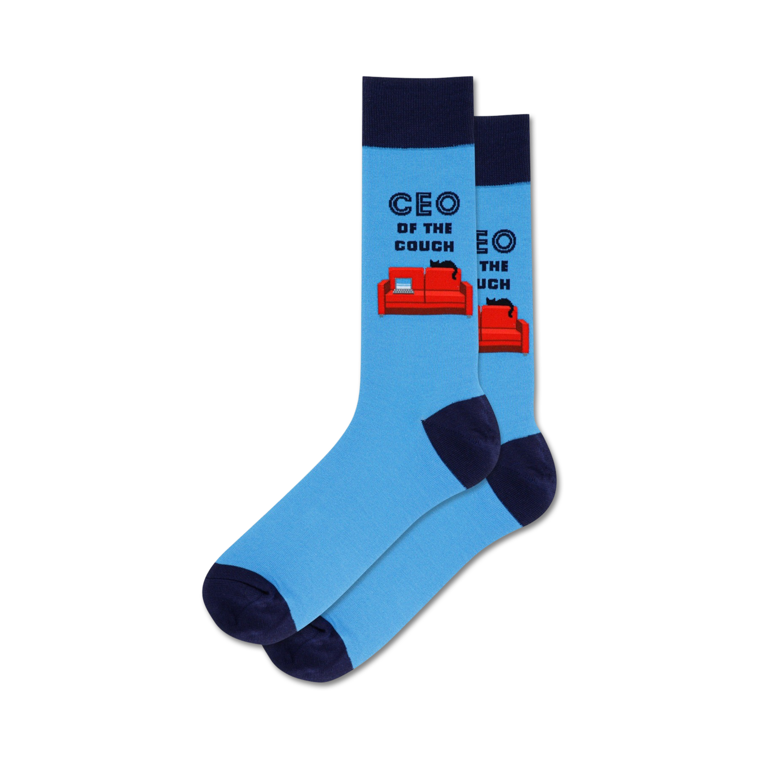 Lounge around in style with our CEO of the Couch socks. These blue socks are covered in red couches with a black cat wearing a crown. The socks are made for men and hit just below the calf so you can stay comfortable while you sit on the throne of your living room.