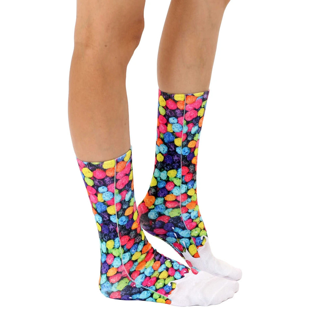 Cerealously Fun Socks: These novelty socks feature a colorful array of ball-shaped cereal pieces in blue, pink, yellow, and green, scattered on a white background. Just like your favorite cereal, these socks bring sweetness and quirkiness to your style. Wear them for breakfast, lunch, or dinner and add a dash of cereal-inspired joy to any outfit.