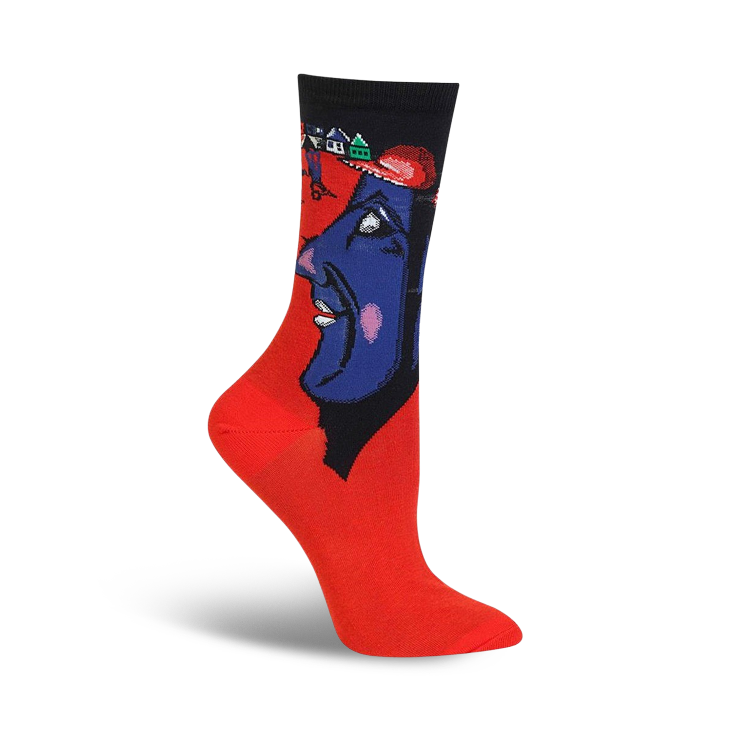 Let Marc Chagall's vision of soft dreams and vague remembrance overlap into your wardrobe with these really cool socks! Each cool, vibrant hued sock features the famous modern art piece "I and the Village" displayed in an eye-catching way. Let your love of all things modern show, from your head to your toes!
