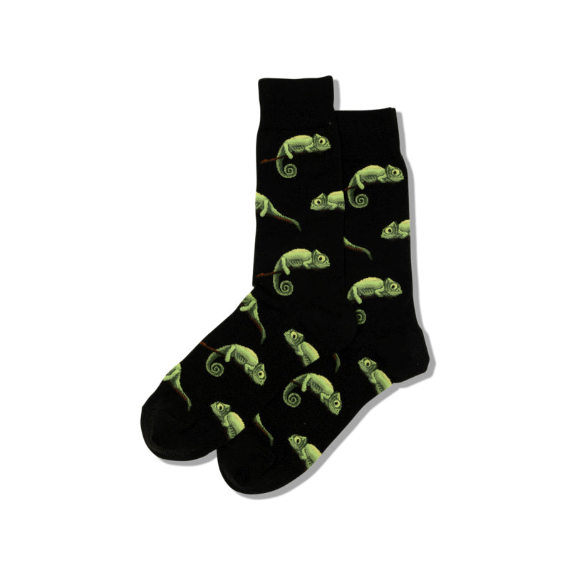 These 'Chameleons' socks are pretty cool. They're black crew socks with a repeating pattern of light green chameleons. The visible chameleons are detailed and look pretty realistic-ish. They're a fun way to add a little unexpected flair to your footwear. The socks shown are a standard crew length - not too short, not too long. A great option for those who like a touch of whimsy in their everyday wear.