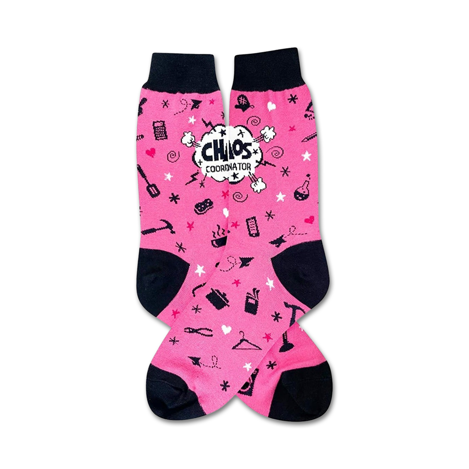 Chaos Coordinator: Take control of your chaotic life with these vibrant pink socks that'll put a spring in your step! With black toes and heels, they're the perfect blend of fun and fabulous. Join the ranks of the organized, one sock at a time.
