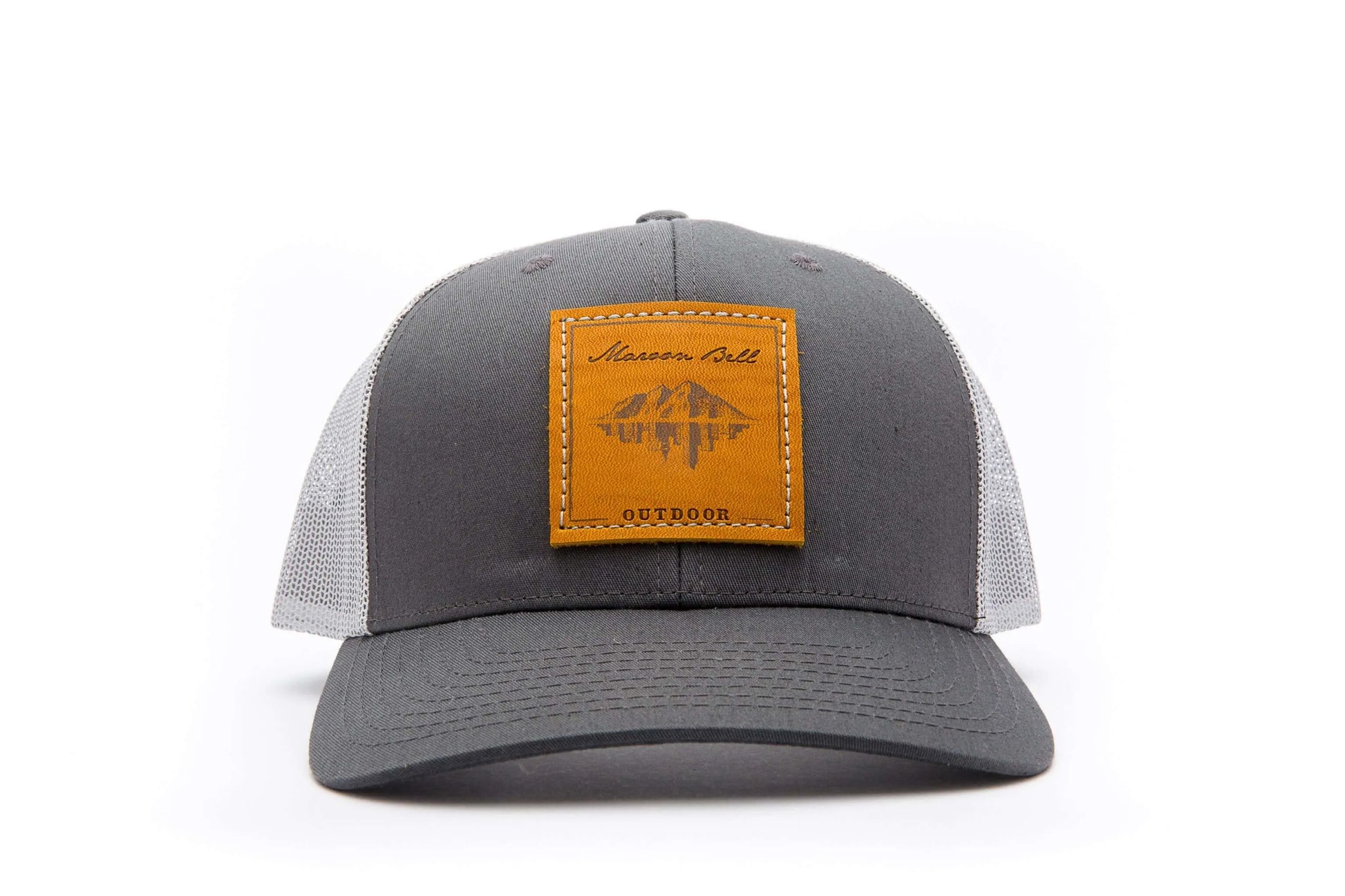 Our classic Custom Charcoal Trucker Hat is made from a cotton twill blend, has a pre-curved visor, an adjustable snap closure and original Maroon Bell Outdoor art on a leather patch.