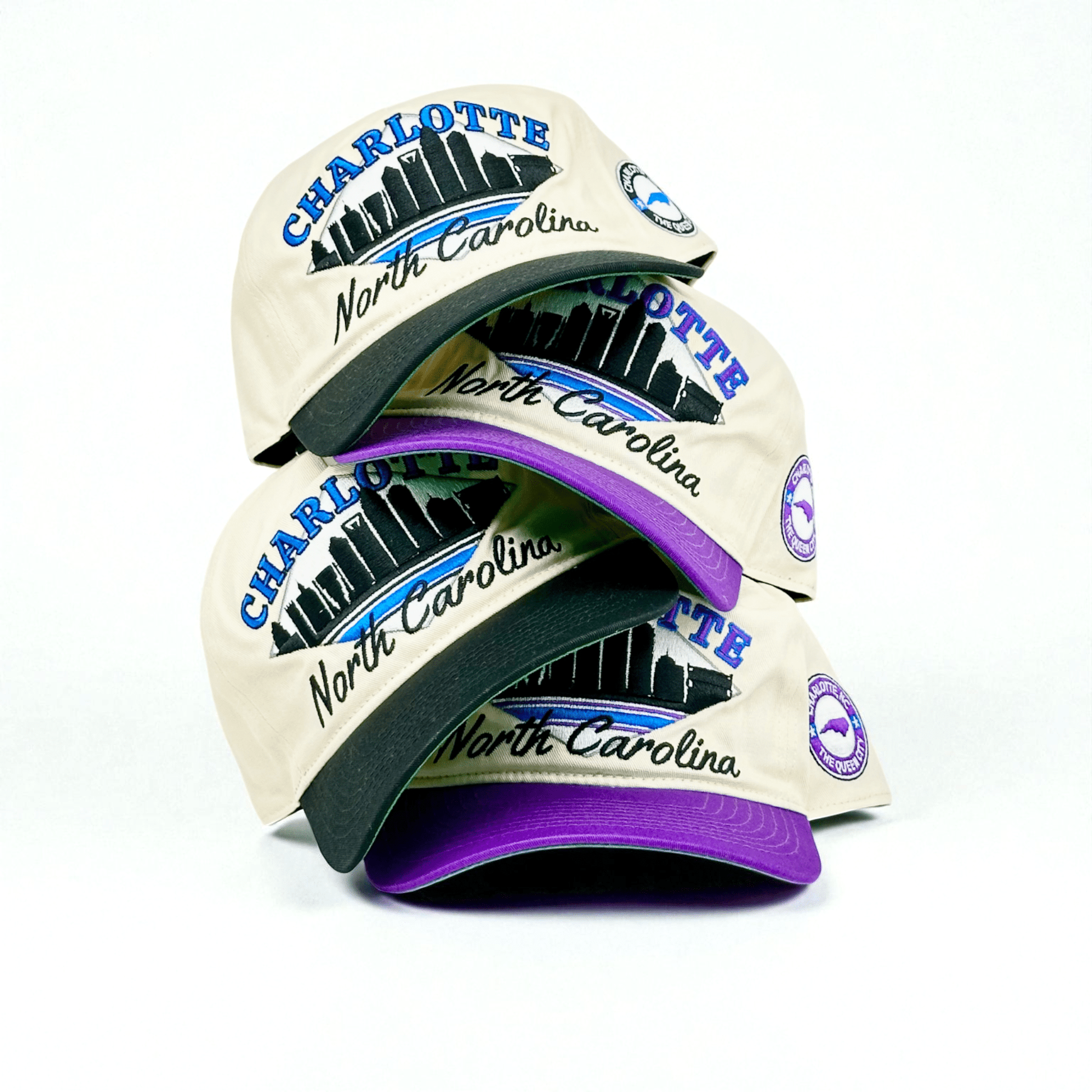 Queen City style with classic teal and purple details. Uptown skyline cuts clean against the cream crown, vintage city mark anchoring the side.