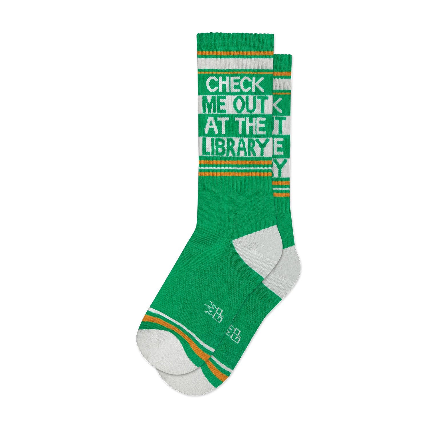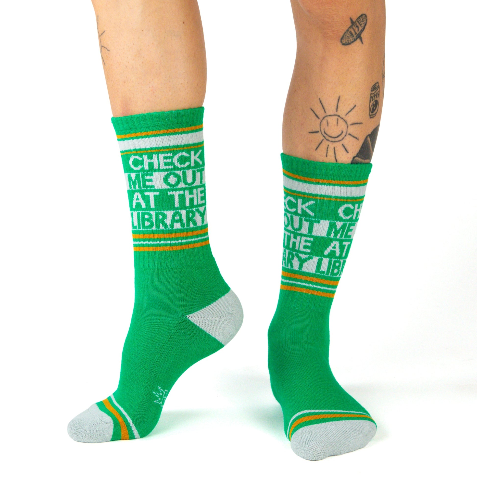 These aren't your grandma's library books. Show off your love of literature (and witty socks) with our 'Check Me Out At The Library' crew socks. The main color is a vibrant Kelly green with a bold white and orange stripe detail at the top and bottom. The message is clearly visible on the sock's body, a fun twist on a classic theme. The shown portion of the socks features a comfortable-looking knit. They're the perfect accessory for bookworms and anyone with a quirky sense of humor.