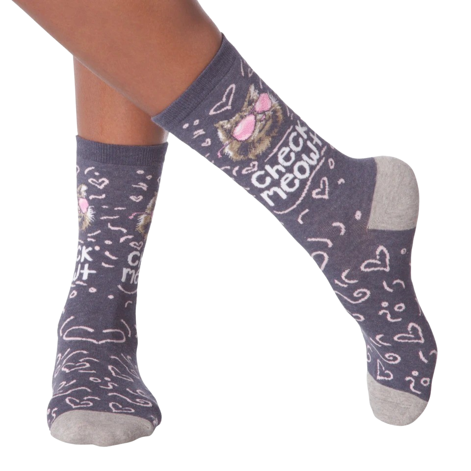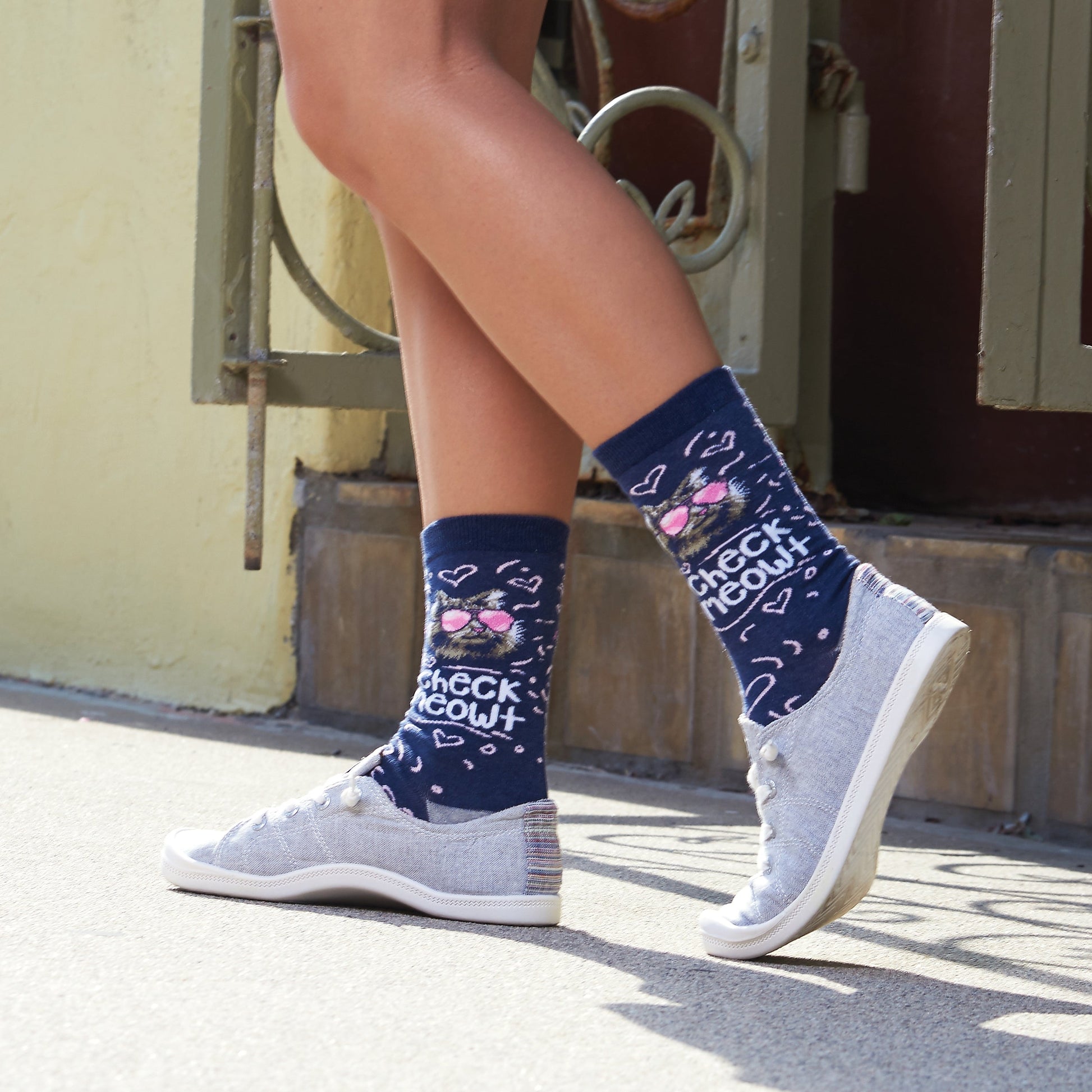 When you are a cool cat, people can't help but notice. Wear these purrfectly silly socks to let them all know you're the cat's meow! Each fun pair of gray and navy crew socks features a sketched heart print in pink with a super awesome cat wearing shades above the ankle. It ain't easy being purrfect.