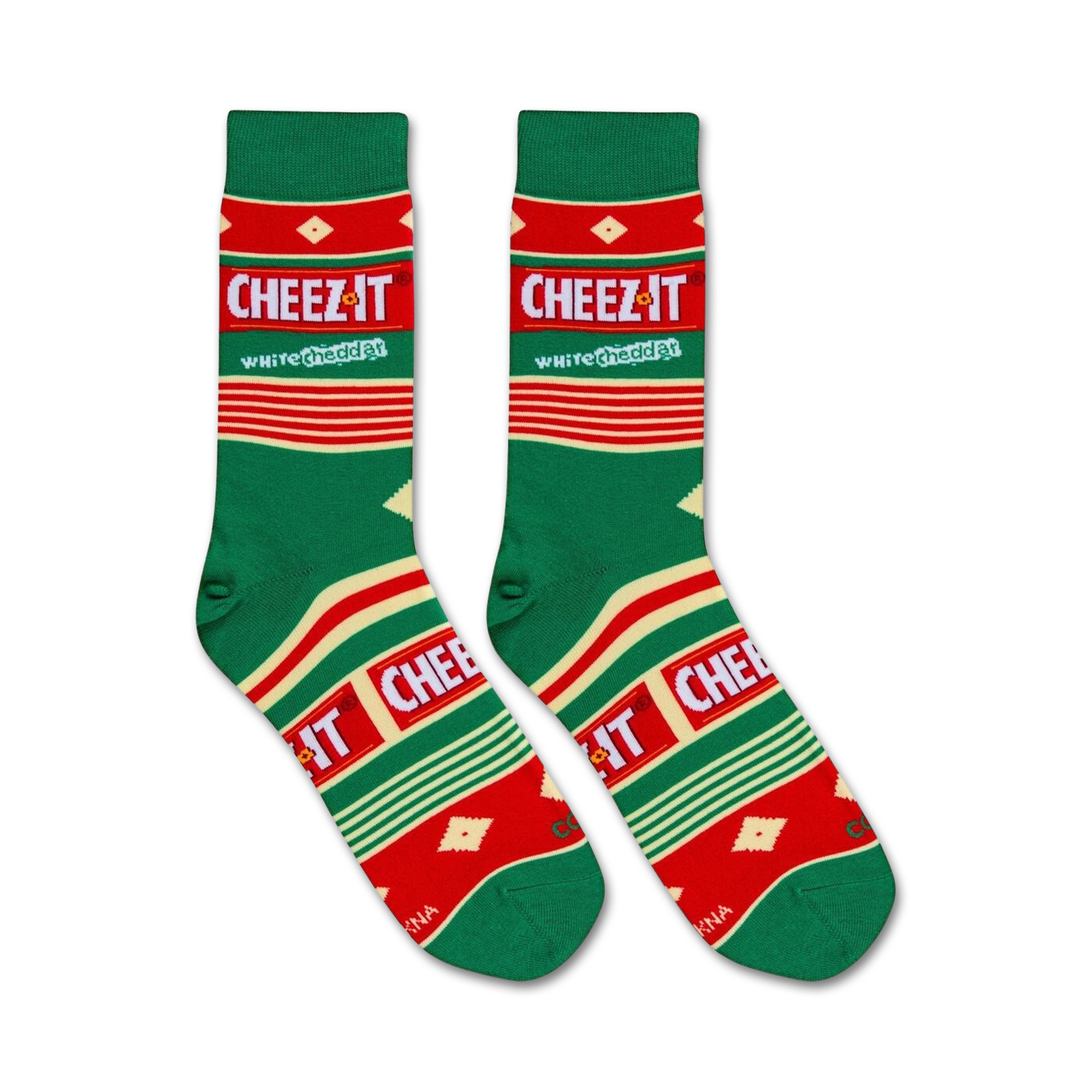 Craving a cheesy kick? Grab Cheez-It White Cheddar Socks! Get ready to snack attack your feet with these white, red, and green crew socks featuring bold Cheez-It stripes and squares. Your feet will do a happy dance because, unlike the real thing, these don't leave cheezy dust behind. Just remember - wearing these is not an excuse to eat a whole box.