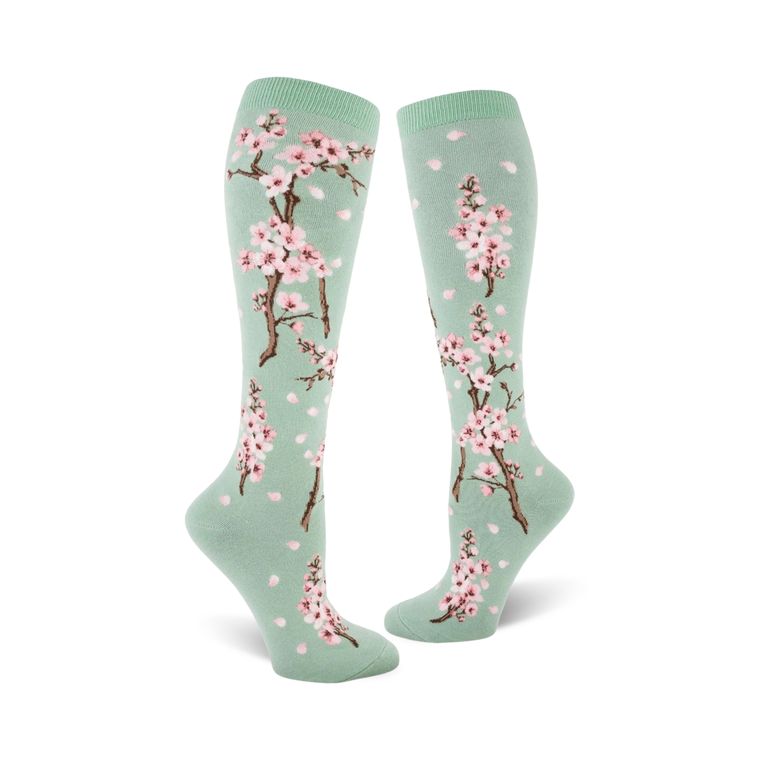 These light green Cherry Blossom Knee High Socks are sure to put a spring in your step. With a playful pattern of vibrant pink and white cherry blossoms scattered among brown stems and lush green leaves, they're like springtime in your shoebox. Whether you're completing a cherry-themed outfit or want a subtle reminder of the beauty of nature, these socks are a blooming delight.