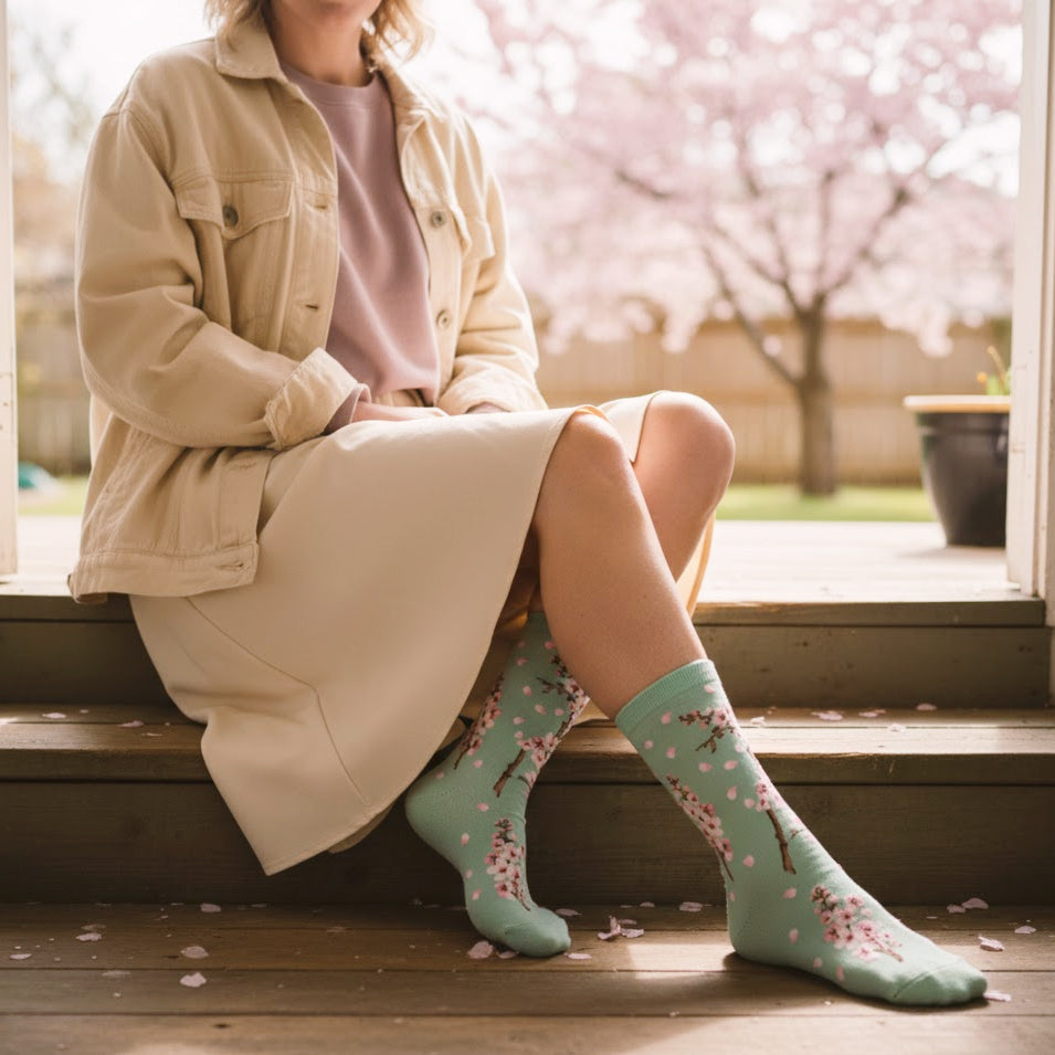 Walk on the wild side in these light green cherry blossom socks, featuring a beautiful pattern of blooming pink and white cherry blossoms. The light green toe and heel add a pop of color, making these socks the perfect accessory for spring. These crew length socks fit women's feet and bring a bit of nature's beauty with every step.
