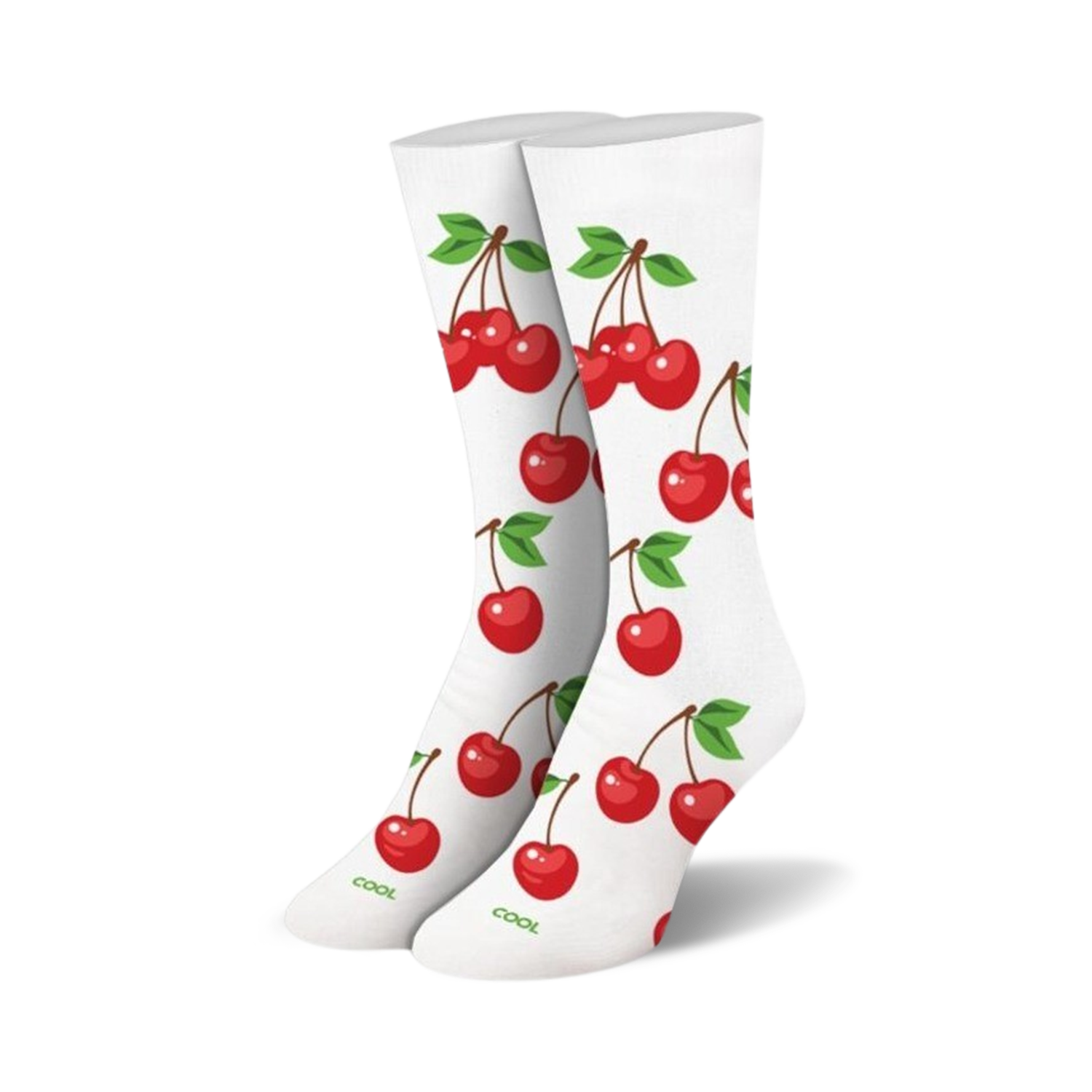Cherry on Top! Sweet style and taste await you with our fun Cherry on Top crew socks for women! Featuring a delightful pattern of juicy red cherries with green stems and leaves against a crisp white background, these socks are sure to bring a touch of sweetness to any situation. Say goodbye to boring basics and embrace the fruity life with every hop, skip, and jump.