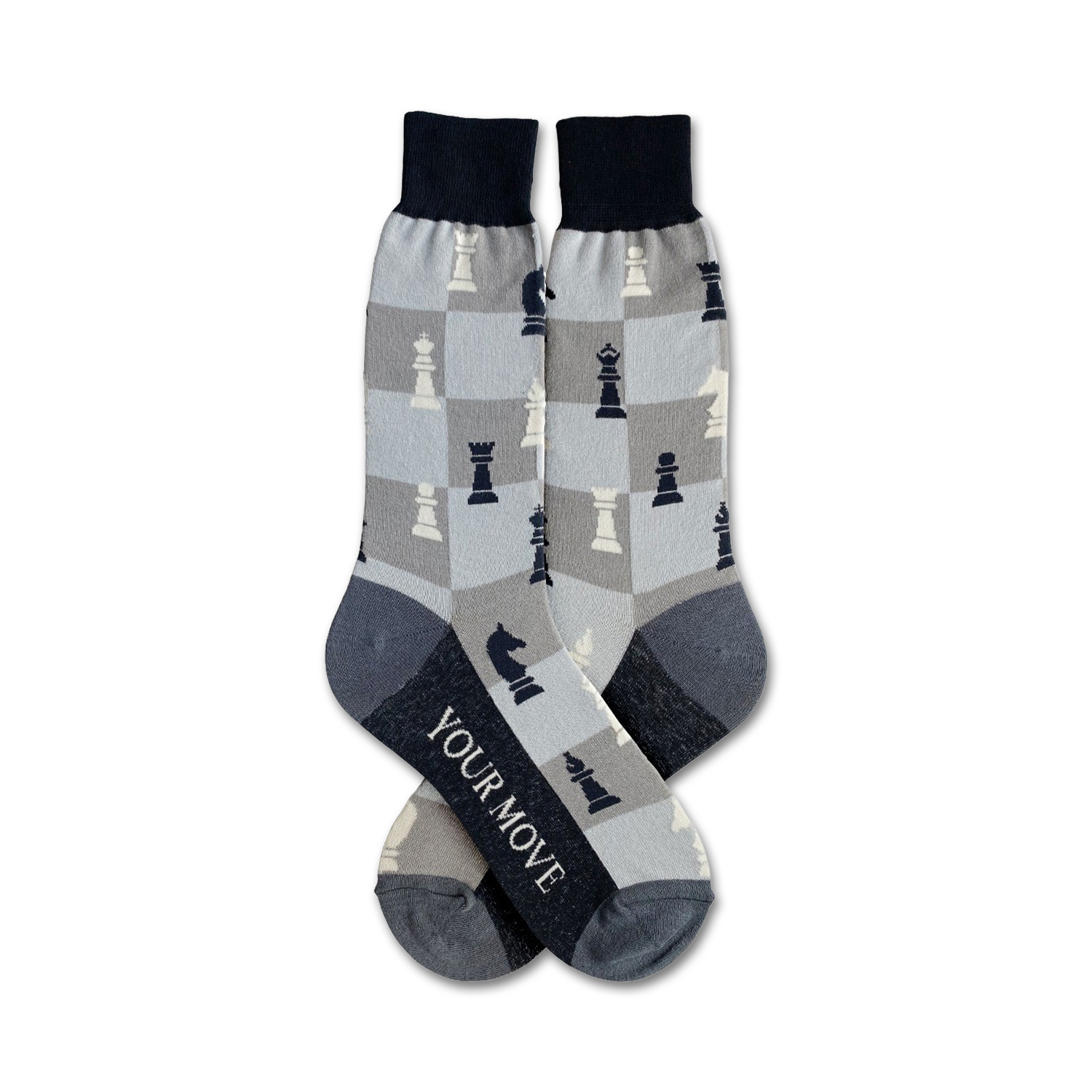 Calling all chess enthusiasts! Get ready to make your next move in style with these "Your Move" chess-themed socks. Featuring a playful pattern of black and white checkered squares, adorned with iconic chess pieces like pawns, rooks, bishops, knights, queens, and kings, these socks are sure to add a touch of strategic flair to your wardrobe. Whether you're a seasoned player or a casual fan, let these socks remind you that life's challenges are just like a game of chess - it's all about strategy and making the right moves. Put on a pair of "Your Move" socks and let the world know you're ready for the next challenge!