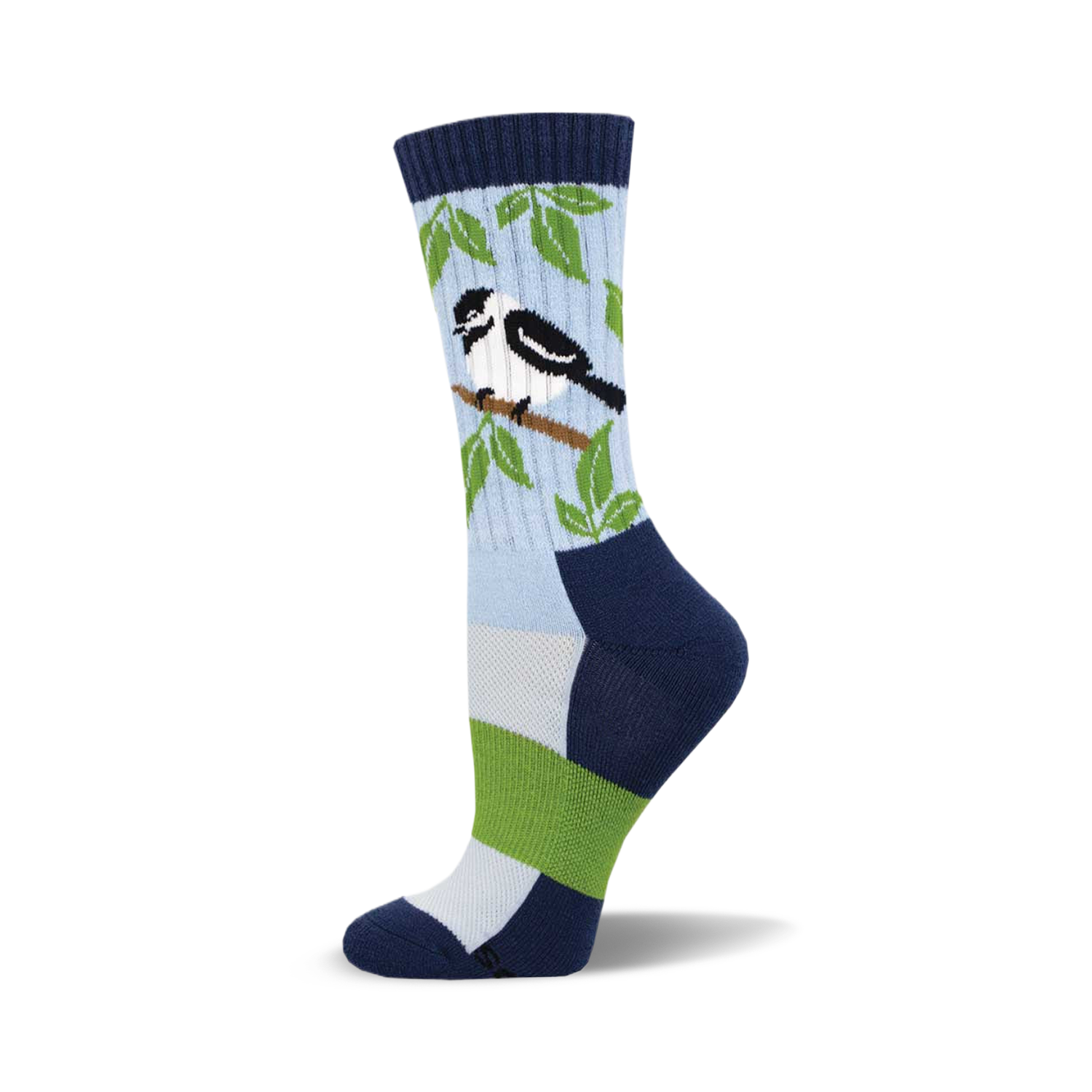 Get ready to perch your toes into something truly tweet-worthy! Meet the "Chickadee" socks, crafted from the finest merino wool for feather-soft comfort that lasts all day. These charming socks flaunt a serene blue backdrop accented with sprightly green highlights, ideal for adding a pop of color to any outfit. The real star, however, is the chic black and white bird perched confidently on a branch, adorning each leg. Perfect for birdwatchers and fashion enthusiasts alike, these socks are more than just a warm layer; they're a conversation starter. Whether you're nesting at home or soaring through your day, the Chickadee socks will keep your feet cozy and your style sharp.