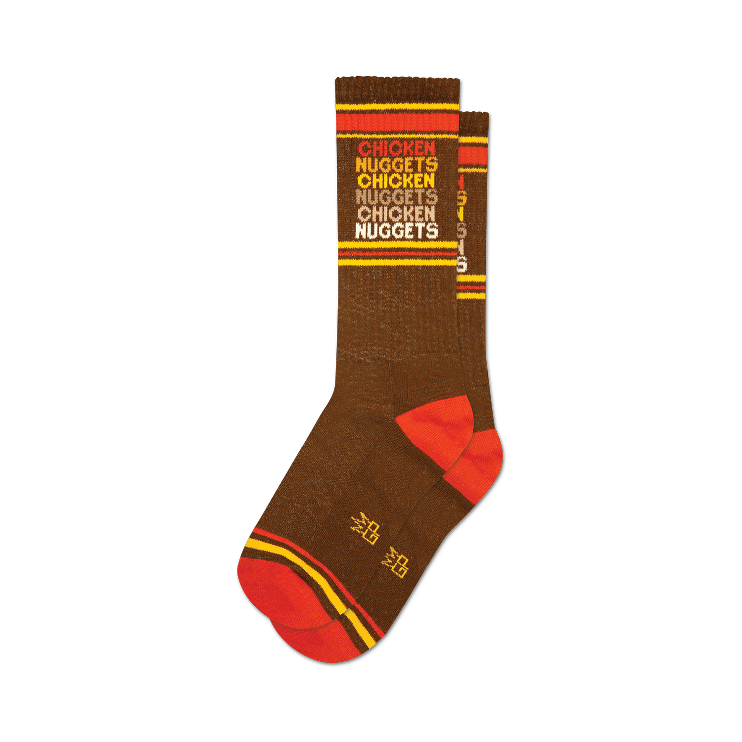 Wrap your feet in the ultimate nugget homage — these aren't just any socks, they're a crispy tribute to everyone's favorite bite-sized snack. Decked out in brown with bold red and orange stripes, they shout out to chicken nuggets in playful pops of orange and yellow text. Perfect for those who like their style served with a side of sauce and a hint of whimsy, these unisex socks are your secret ingredient to a comfort food-themed wardrobe. Keep your toes cozy and your outfit flavorful, no dipping sauce required.