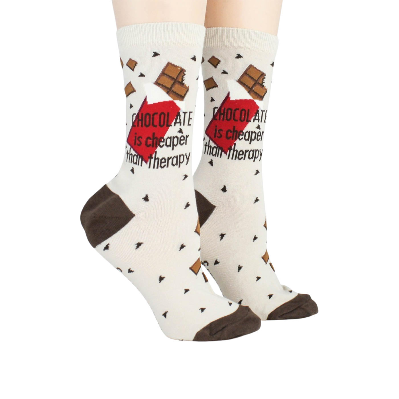 Calling all chocoholics! Treat your feet to a sweet adventure with our Chocolate Crew Socks! Adorned with white socks, brown polka dots, and the uplifting messages of 'Chocolate is cheaper than therapy' and 'Chocolate fixes everything!', these socks will satisfy your cravings for fashion and fun.