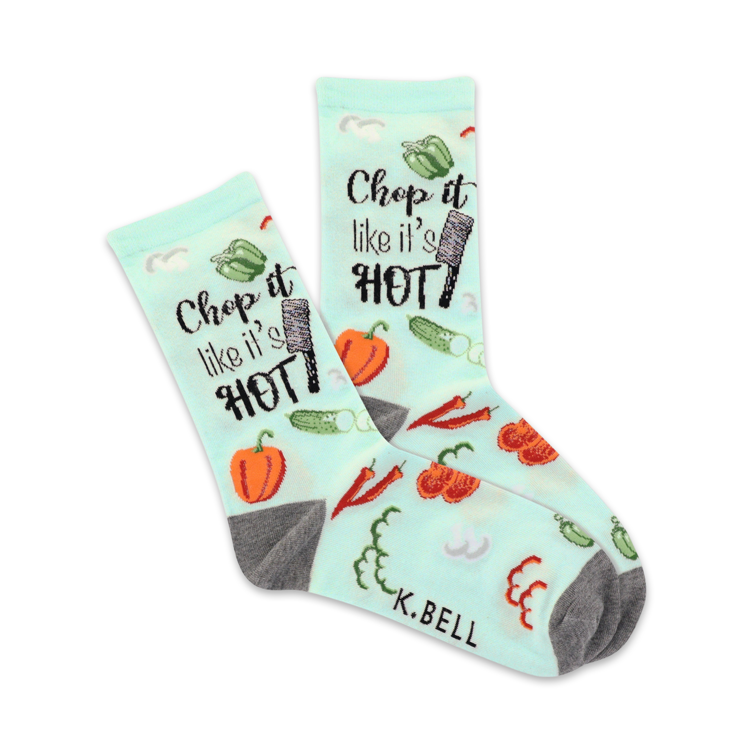 Calling all cooking enthusiasts! Chop It socks are just what you need to bring some spice into your kitchen. Featuring a vibrant pattern of vegetables with the phrase "Chop It Like It's Hot," these crew-length socks will have you dancing while you dice. Get ready to turn up the heat and serve up some style. Who says cooking can't be fun? Slip on a pair of Chop It socks and let your inner chef shine.