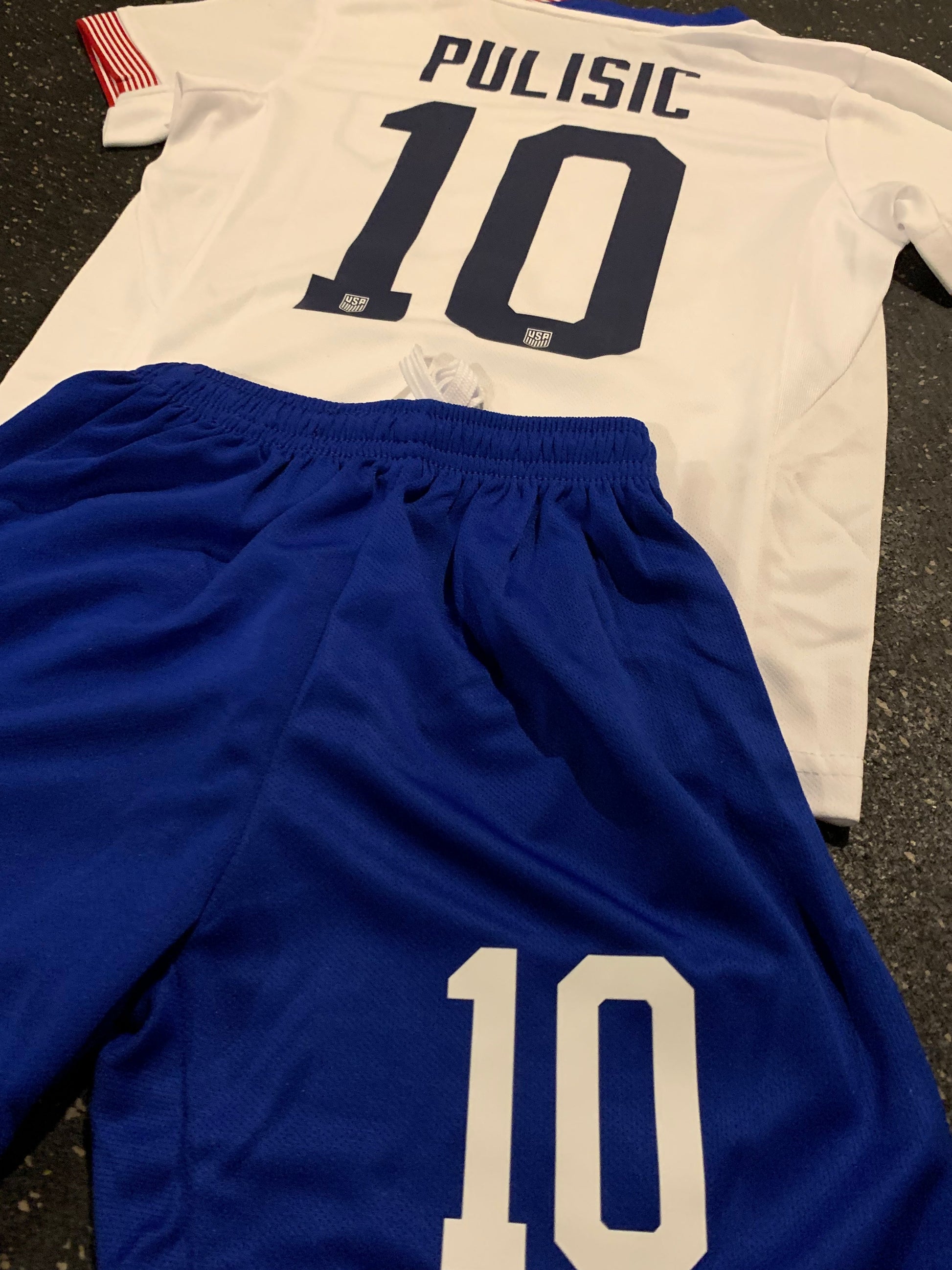 Christian Pulisic Kids Soccer Jersey Set Set Football Youth Toddler Sizes. Futbol Youth Toddler Football Shirt and Shorts matching set. Toddler Youth Tshirt Awesome Youth Soccer Jersey and shorts set of 2. Size 2T, 3T, 4T, 5T, Extra Small, Small, Medium, Large, Extra Large, 18, 20, 22, 24, 26, 28, 30. All in stock ships within 12 hours from order time. We ship from Missouri. All soccer jerseys are brand new and never tried on. Amazing Screen Printing & Embroidery.