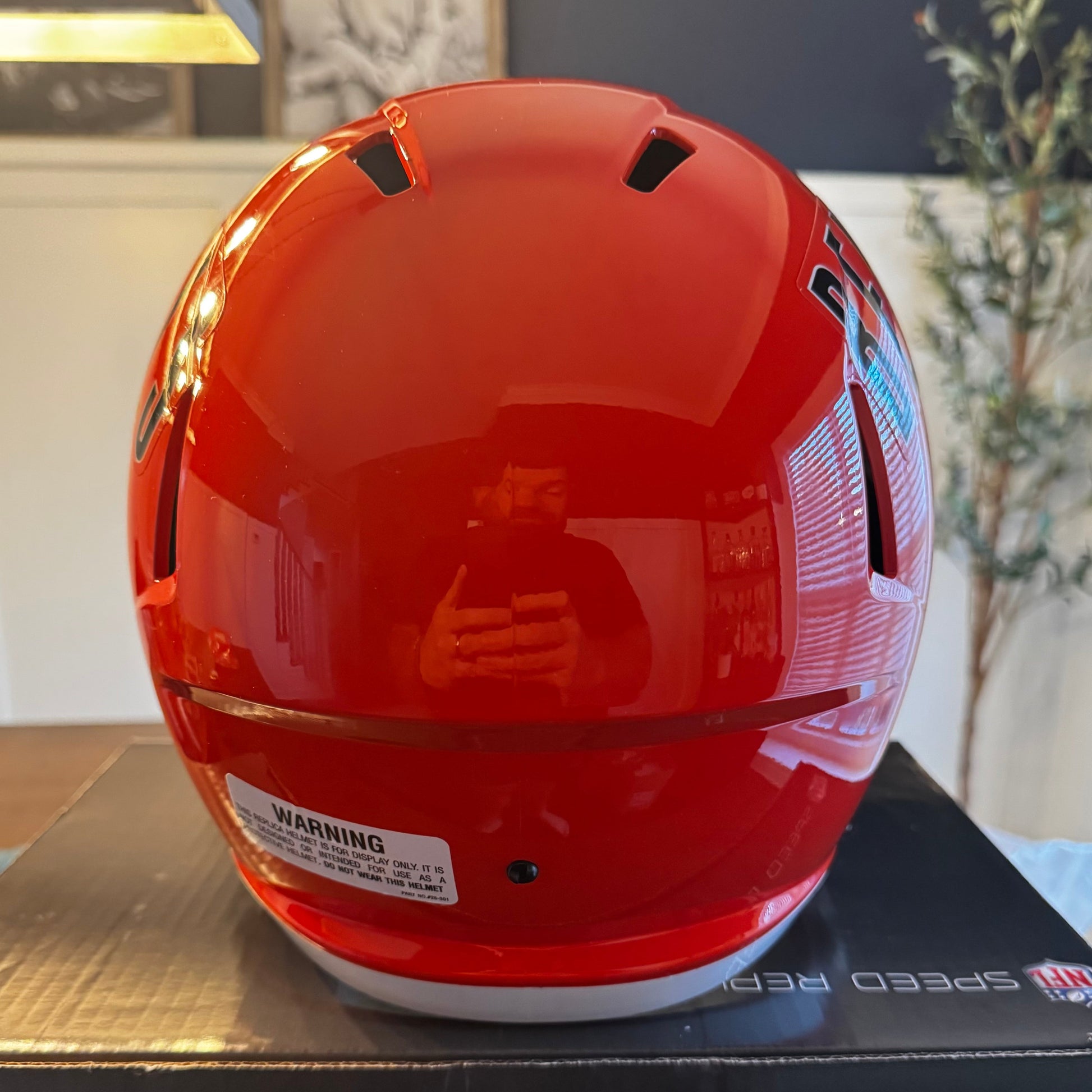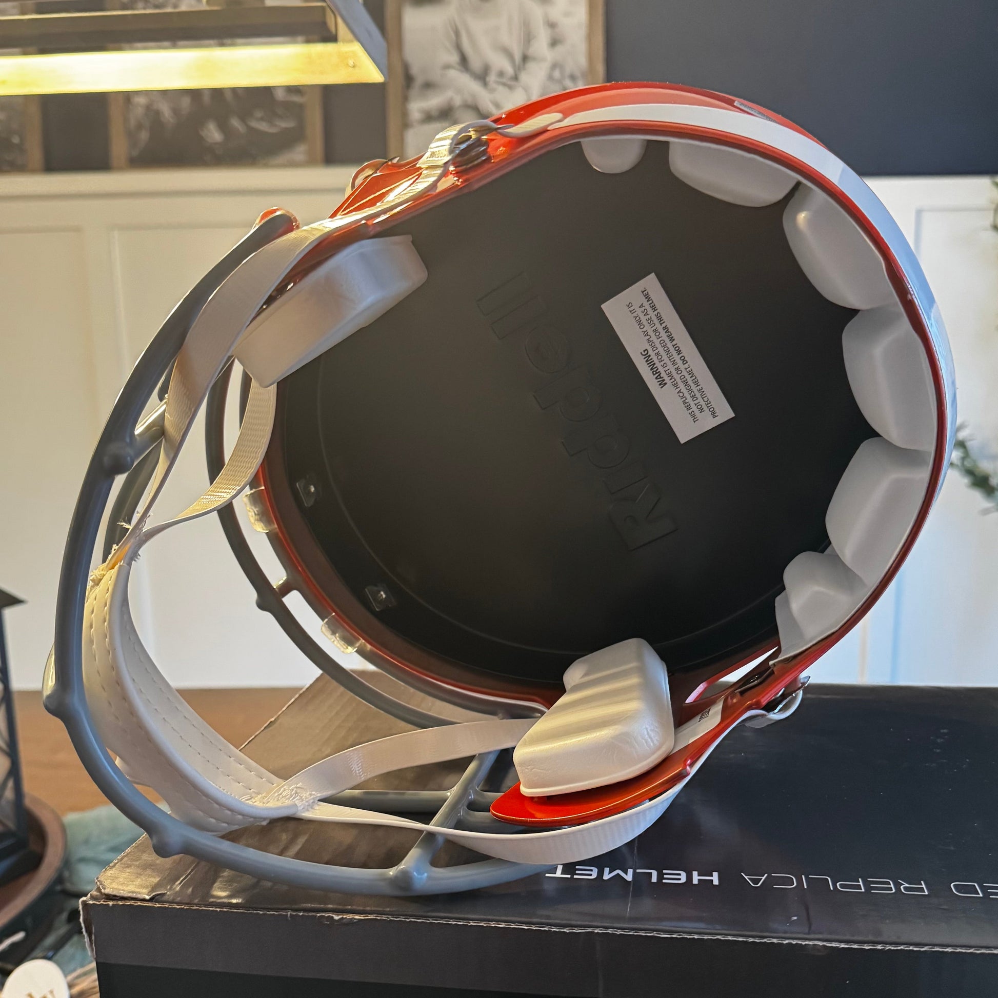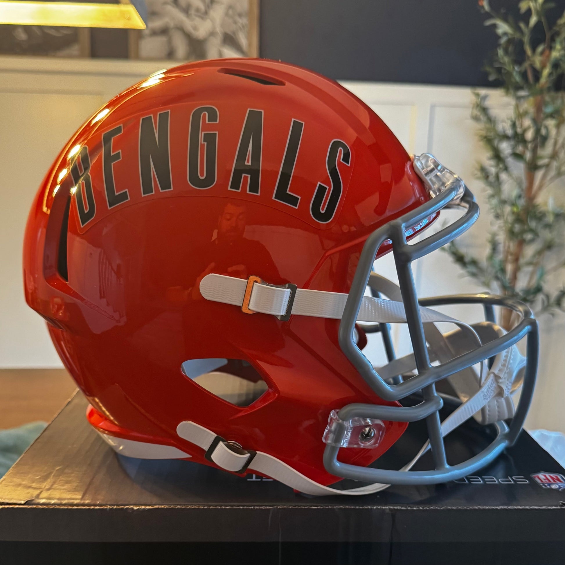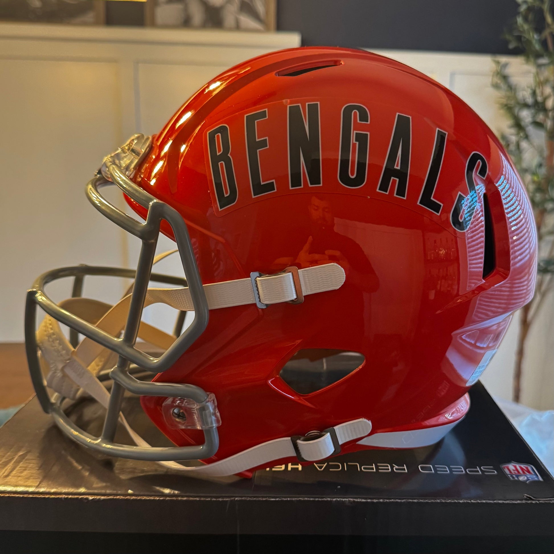 Cincinnati Bengals Full Size Speed Replica NFL Helmet by Riddell. This full size Bengals helmet is designed with a non-wear plate and molded foam jaw pads. a steel polyvinyl-coated face mask, 4-pt chin strap, and elliptical air vents. NFL Team name on back bumper (except Chiefs, Steelers and Giants). The officially licensed NFL helmet is great for autographs and features Bengals team logo decals on both sides. The striking shape of the future. NFL Bengals Replica Speed helmet size medium measures: 12.75"(L), 9.25"(W), 9.75"(H). NFL Cincinnati Bengals Full Size Speed Replica Helmet. (NOT FOR WEARING)
