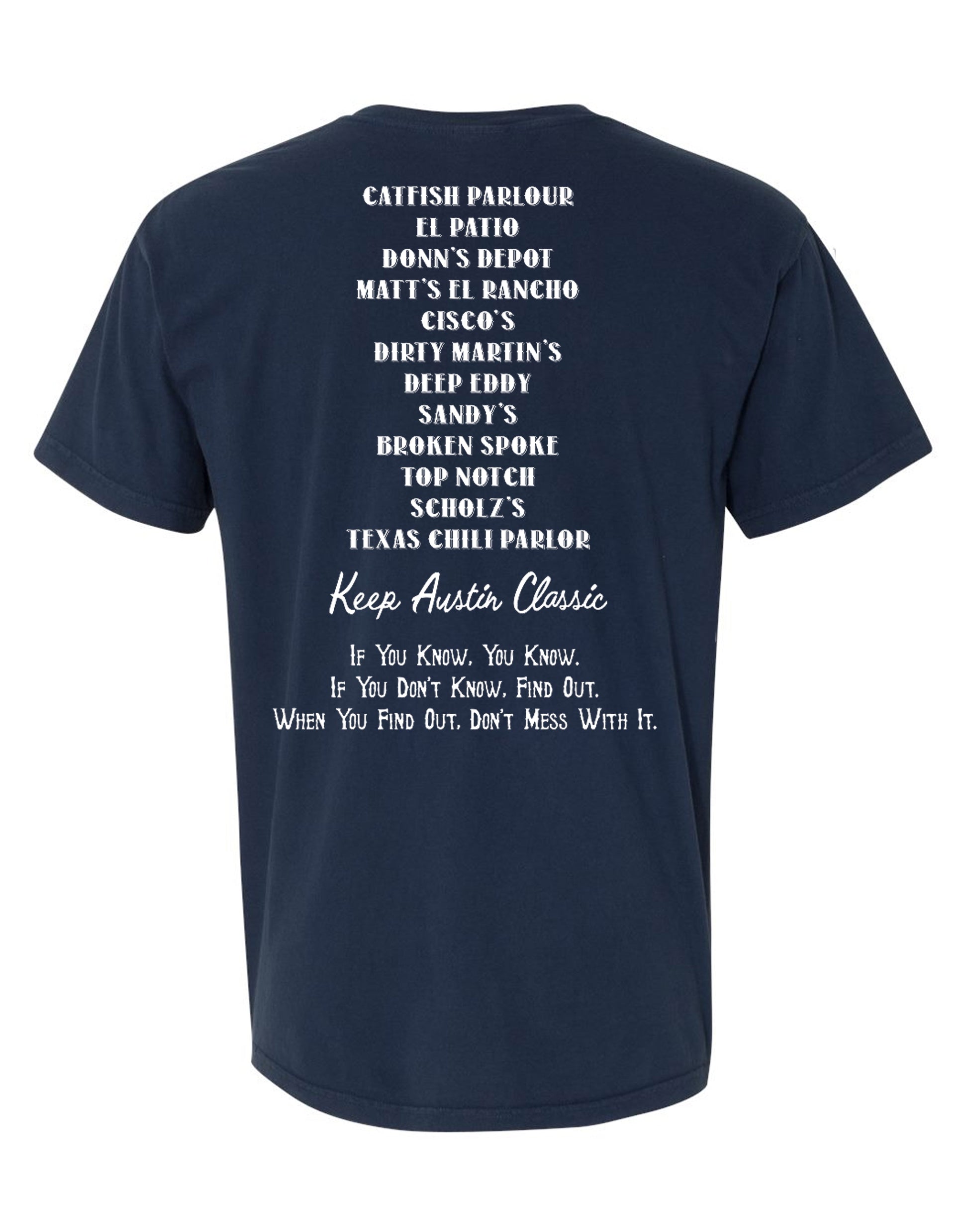Austin, Texas. Our hometown and the capital of the greatest state in the country, is one of the most unique cities you'll come across. It's an awesome city, and because of that more people keep on coming here and it keeps growing. This growth, while good to keep any city thriving, can sometimes hurt a town's identity. But Austin still clings to hers, and this t-shirt pays homage to some of the awesome local spots that help keep Austin what it is...a pretty cool place to live.