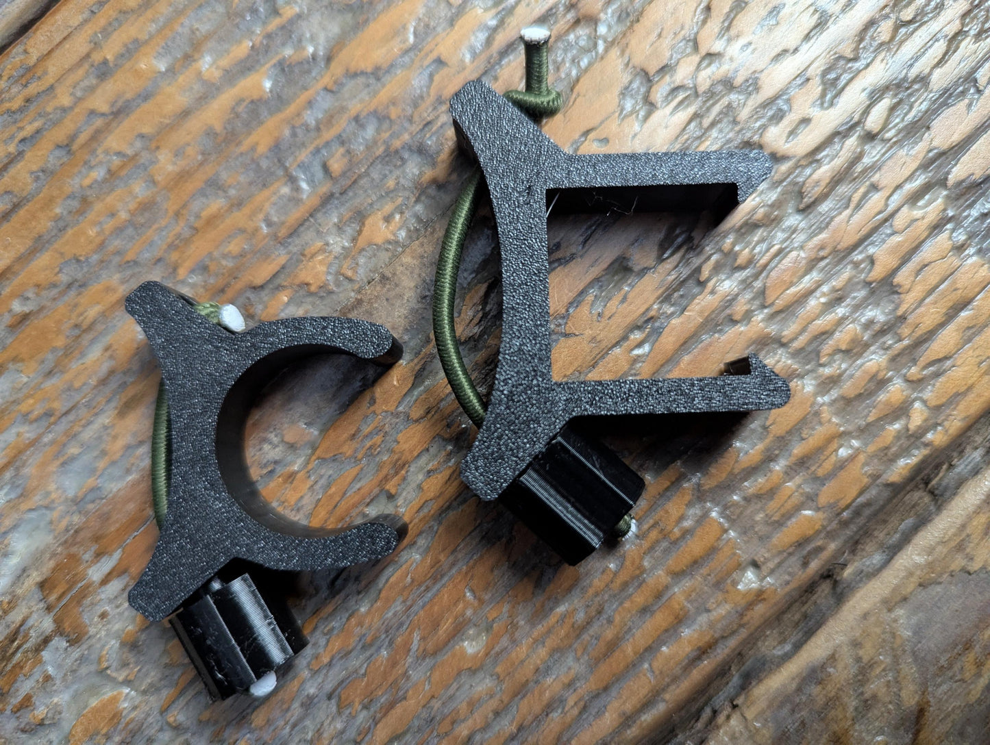 The body is printed with PETG and the "knob" is a rubbery TPU. The strap is a green elastic bungee.
