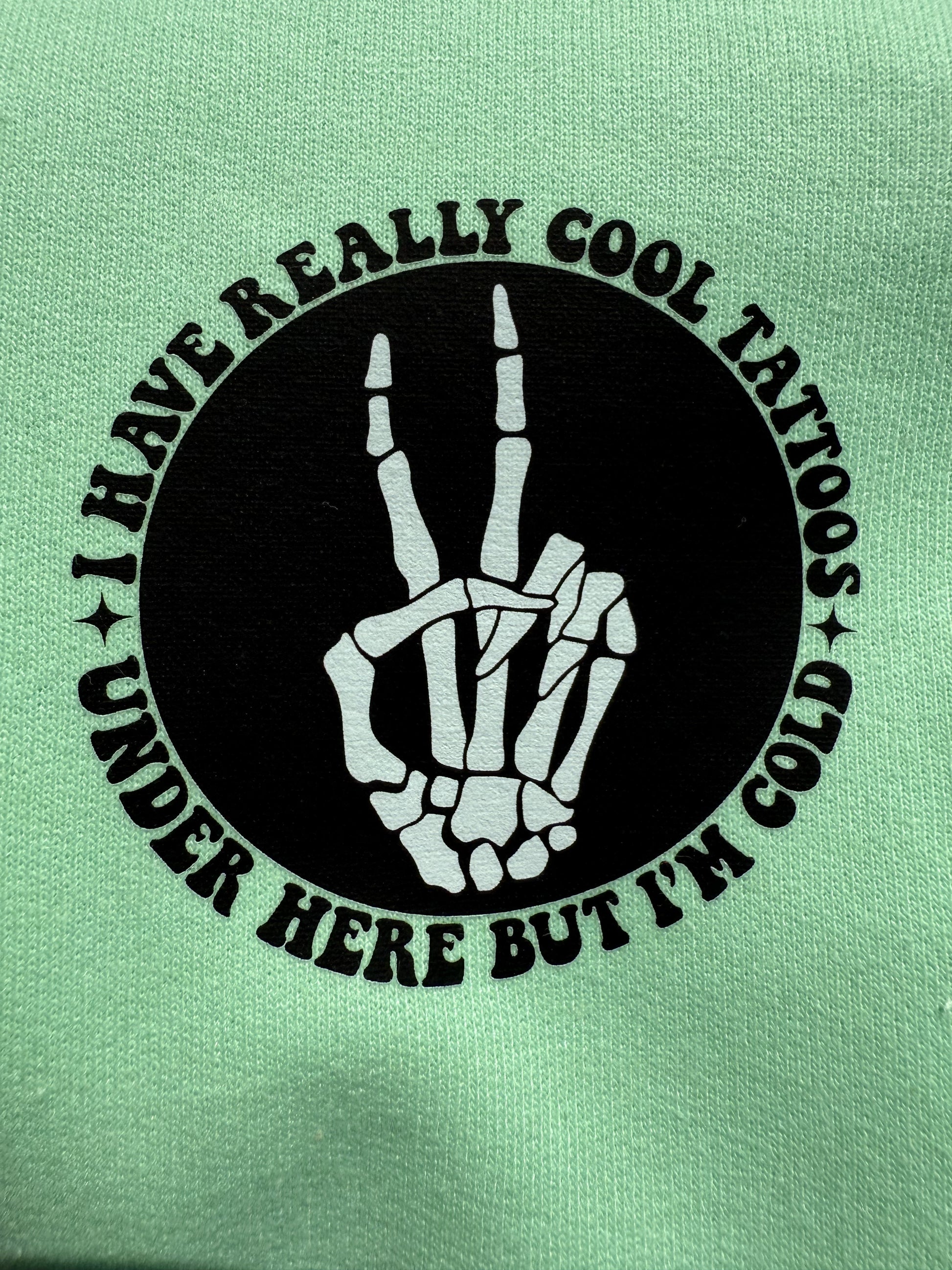 Printed on a bright mint hoodie that screams look at me even though your arms cannot, this sweatshirt is made for people who want the world to know they are tough but temperature sensitive. Whether you are covered in ink or just have one tattoo you will regret later, this hoodie makes sure everyone knows there is cool stuff hiding underneath.
