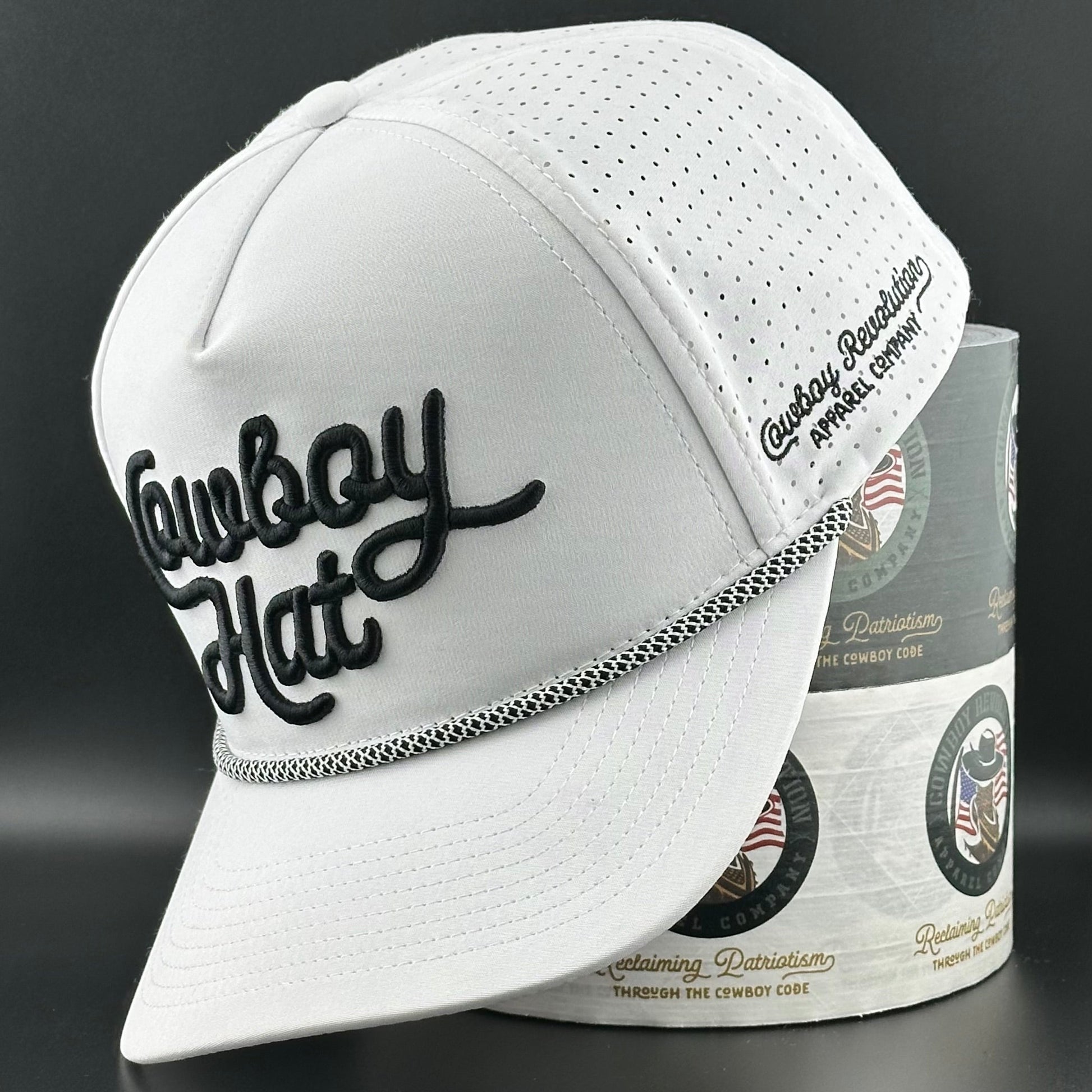 Introducing the white "Summer Edition" Cowboy Hat by Cowboy Revolution Apparel Co., designed to keep you cool and stylish all season long. Made from a moisture-wicking polyester-spandex blend, this 5-panel trucker hat is a must-have for both free-spirited hippies and rugged cowboys.