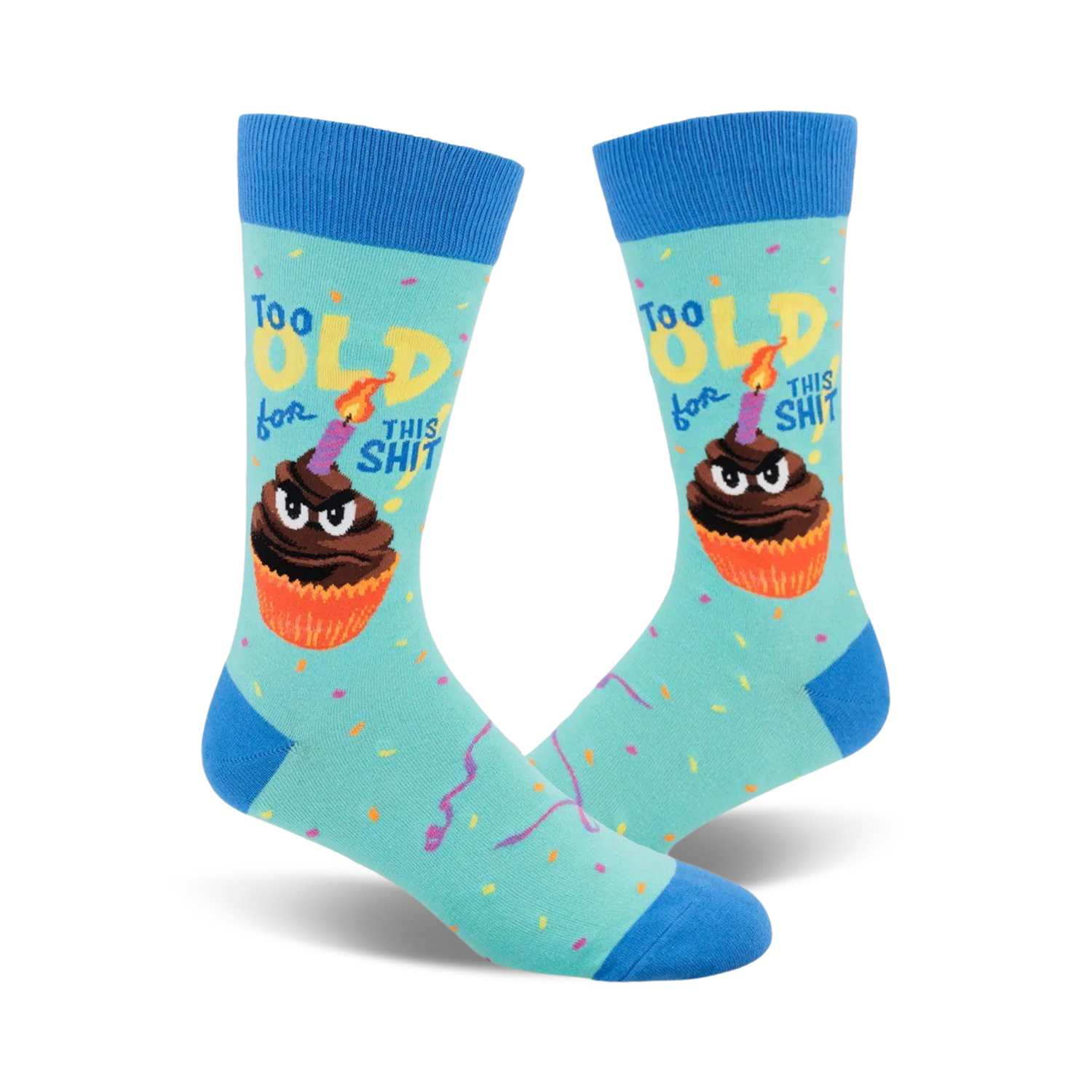 Crappy Birthday socks: When birthdays become a bummer, the socks keep things humorous. Blue at the top, these socks declare 'Too Old for This Shit' below a solitary cupcake with candle. These crew-length, men's socks are a fun reminder that life doesn't stop being hilarious, it just changes with age.
