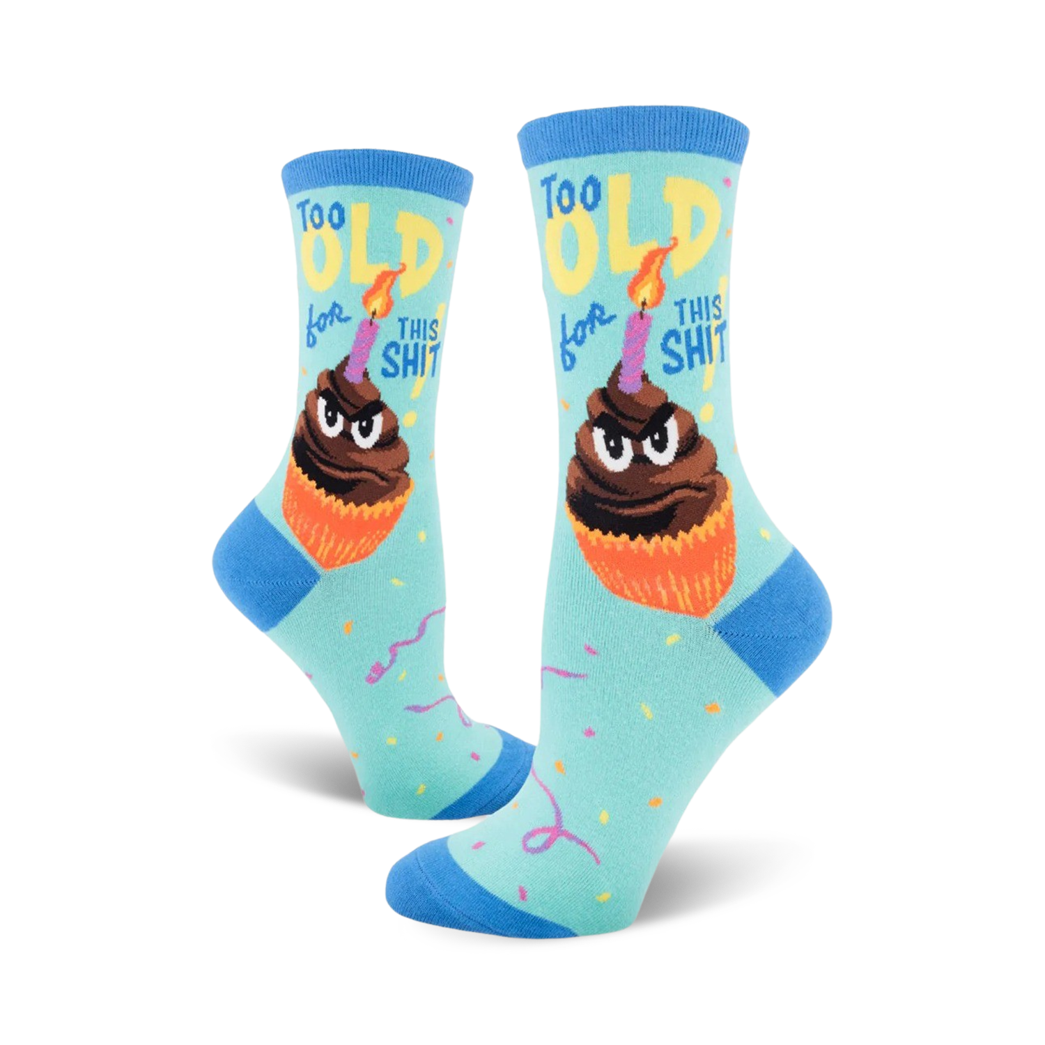 Picture this: you're wearing these Crappy Birthday socks, sipping your morning coffee, and thinking, "Yup, I'm too old for this sh*t." The socks feature an angry cupcake with a lit candle that reads "Too old for this sh*t." These socks will add a dash of grumpy charm to your footwear collection. Made for women with a crew length, these socks will keep you comfy all day long.