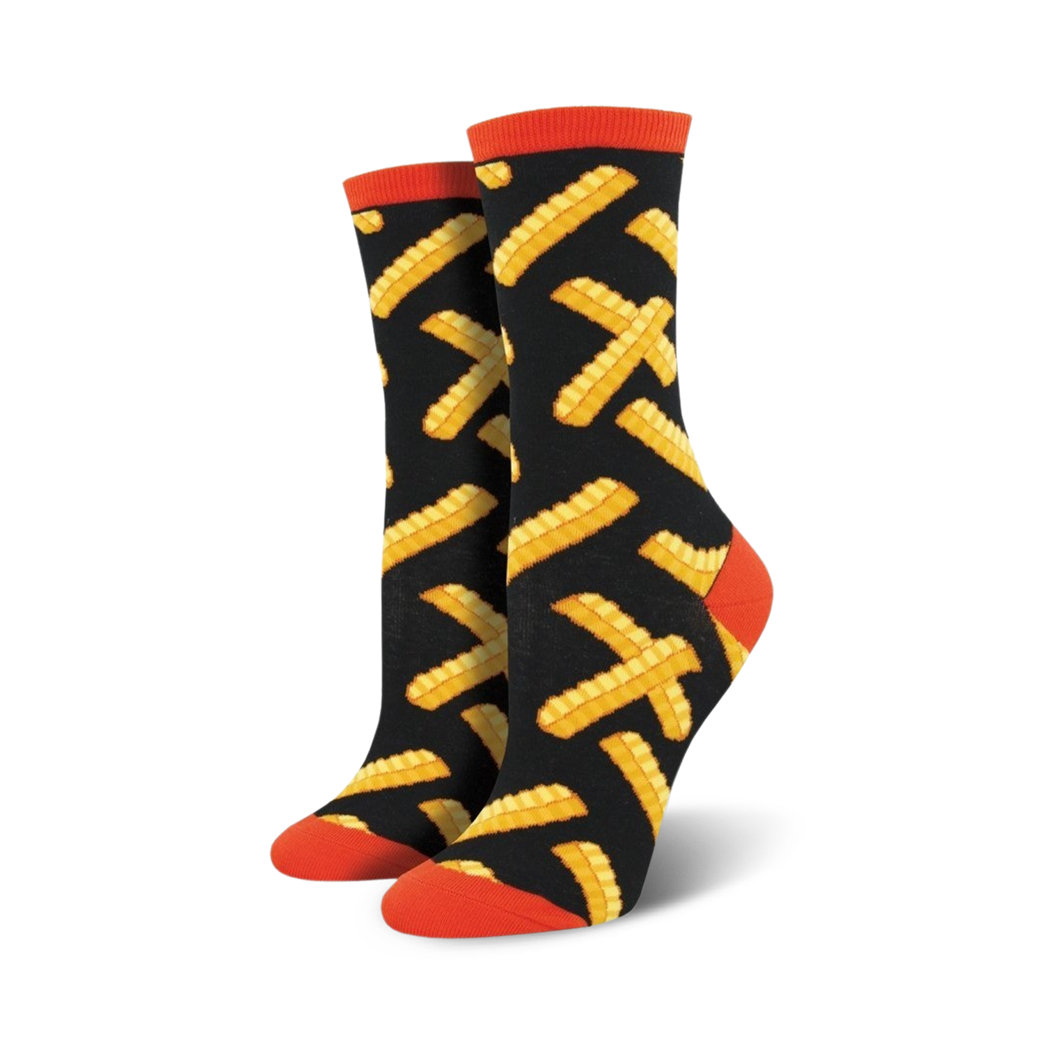 These Crinkle Cut socks will satisfy your hunger for style. Perfect for any foodie, these high-quality socks are made with soft, comfortable fabric and feature a fun allover pattern of cartoon-style crinkle-cut french fries on a black, orange, and white color. Guaranteed to put a smile on your face and make your feet happy.