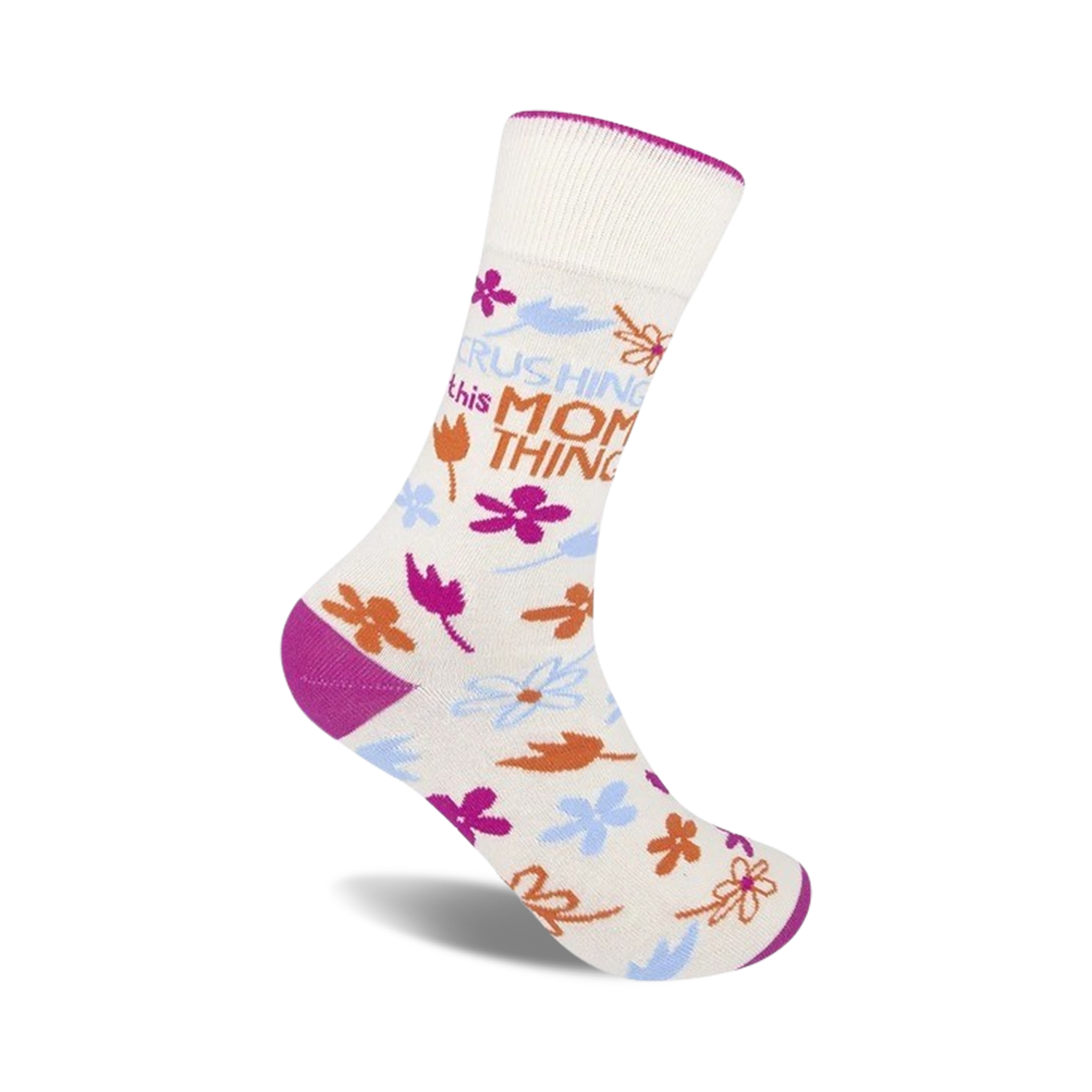 Rock 'Crushing This Mom Thing' socks, and show the world you're a total mom boss! With a vibrant purple toe and heel and playful florals, these white crew socks are a sassy declaration of your multitasking prowess. Show off your mom game while crushing life's challenges with these confident and comfortable socks.