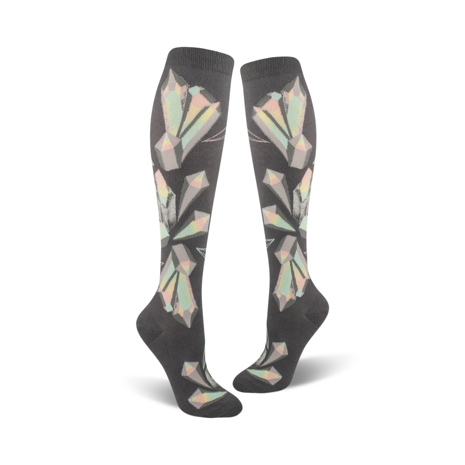 Crystals take knee-high socks to a whole new dimension, with a pop of multi-colored pizzazz. These silky and vibrant socks boast a cosmic kaleidoscope of light gray, blue, green, yellow, pink, and white crystals, so you can go from ordinary to rockstar in seconds!