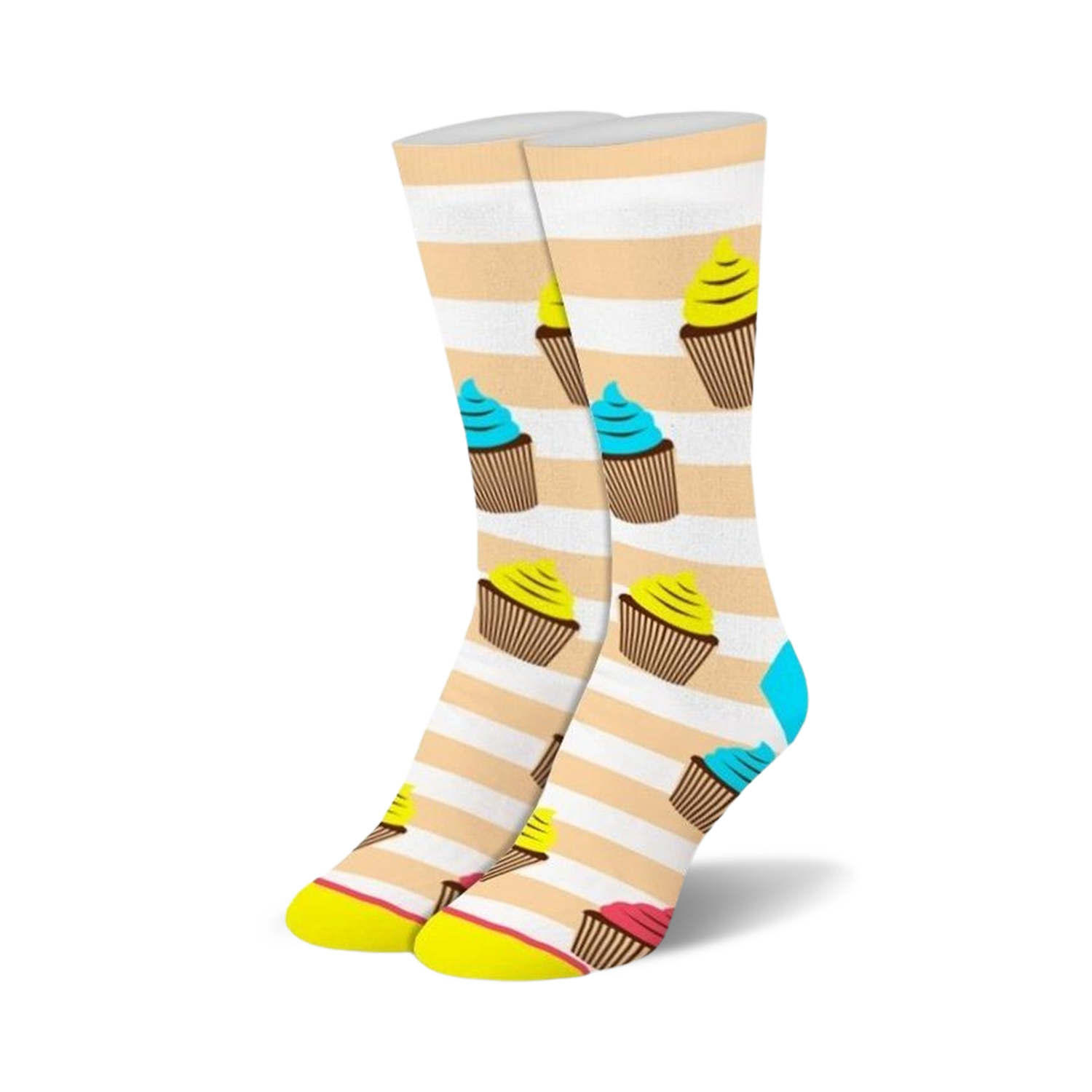 Introducing Cup Cakes socks, the sweetest novelty socks that will leave you craving more! These white socks with light brown stripes are adorned with an adorable pattern of yellow cupcakes with blue or pink frosting. Whether you're a baker, a cupcake enthusiast, or just someone who loves fun socks, these Cup Cakes socks are sure to bring a smile to your face. Plus, with their crew length, these socks will keep your feet cozy and comfortable all day long. These Cup Cakes socks are the perfect gift for any occasion, so treat yourself or a friend to a pair today!