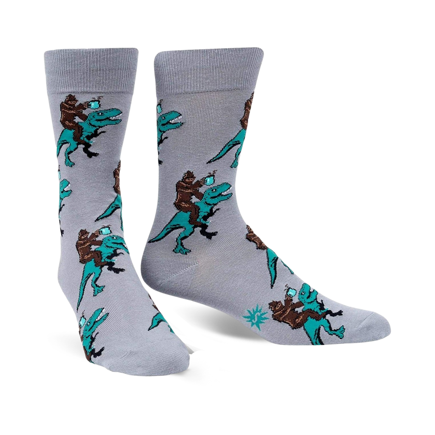 Unleash your inner Bigfoot with these captivating Cup of Ambition socks! Witness the prehistoric union of Bigfoot and dinosaurs in an enchanting spectacle of black, brown, and teal. Representing the resilience and power of Bigfoot, these socks are as robust as the mythical creature they depict. Perfect for those who dare to conquer new heights, these socks will make your day. Embrace the legends and create your own narrative as you tread through life with these iconic Bigfoot-riding-dinosaurs socks.