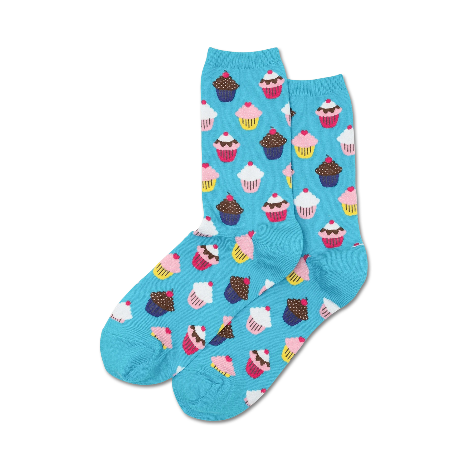 Cupcakes! These socks are delicious! In a sweet blue background, they're covered in cupcakes topped with frosting in 3 colors, a cherry or sprinkles. They're the treat you'll always have on your feet. Cute, delicious, you might even get hungry looking at these mouthwatering pastries. They're covered in cupcakes with blue, pink, yellow and brown frosting and either a cherry or sprinkles on top. The Cupcake sock is just what you need if you're in the mood for something sweet.