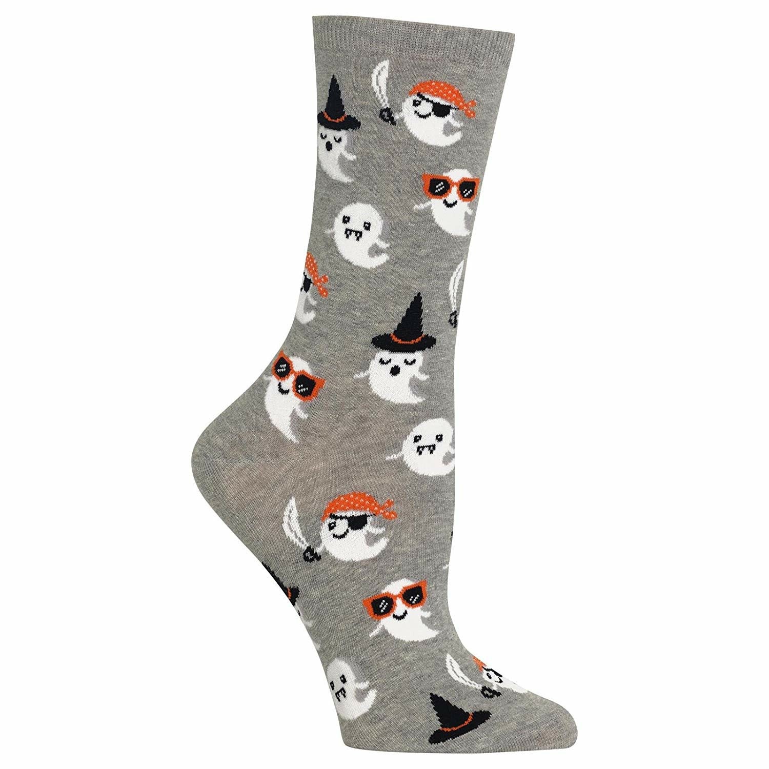 Check out these Cute Ghost socks!  They're bright orange with a pattern of adorable little ghosts.  Some ghosts are wearing pirate eye patches and hats, others sport sunglasses. It's a fun, spooky, and totally charming design. The socks shown are crew socks, and the orange color is really vibrant. These are perfect for Halloween or anytime you want to add a touch of playful whimsy to your outfit.  They're comfy too - we promise!
