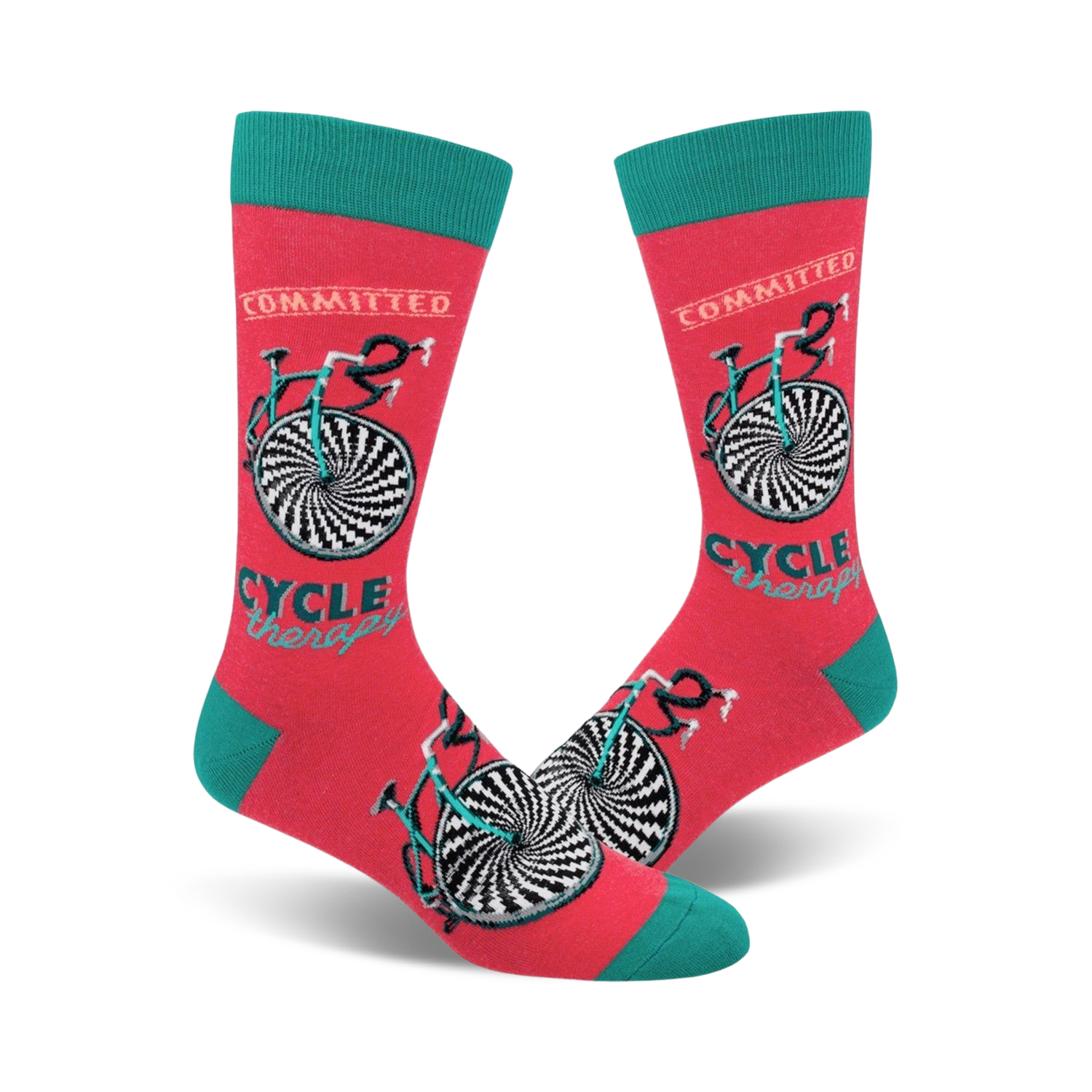 Cycle Therapy crew socks will take you on a thrilling ride thanks to their eye-catching design. Rock these vibrant pink socks adorned with a teal green bicycle and the phrase "Committed...Cycle Therapy." Say aloha to smiles and compliments as you pedal your way through your day, spreading positive vibes on two wheels. Embrace the spirit of cycling and infuse your wardrobe with a touch of audacious fun.
