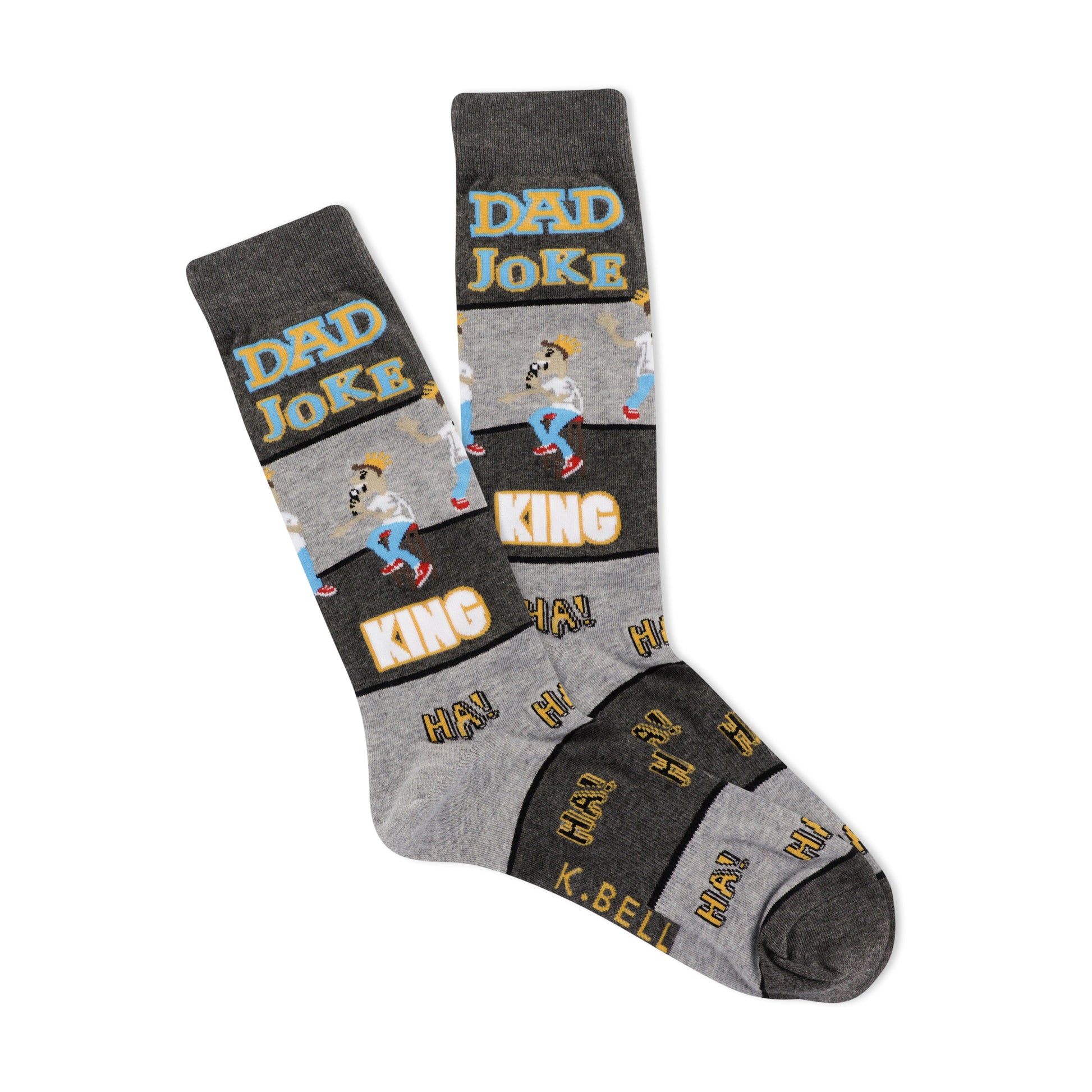 These 'Dad Joke King' socks are a fun mix of gray and dark gray. The visible pattern includes illustrations of a cartoon dad telling jokes, along with the words 'DAD JOKE KING' and repeated 'HA!'s. The socks shown are crew socks, and the design is pretty straightforward and silly.