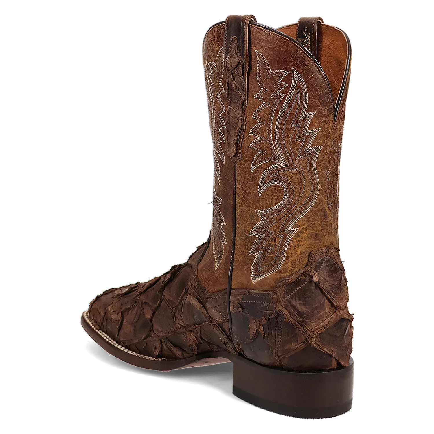 The Dan Post Raymond Men's Pirarucu Cowboy Boots are an exceptional blend of exotic luxury and practical Western style. Crafted from genuine pirarucu fish leather, these boots boast a unique and striking texture that stands out for its bold, natural scale patterns. The 11-inch shaft is designed with understated detailing, allowing the distinctive material to take center stage while maintaining a classic Western silhouette.