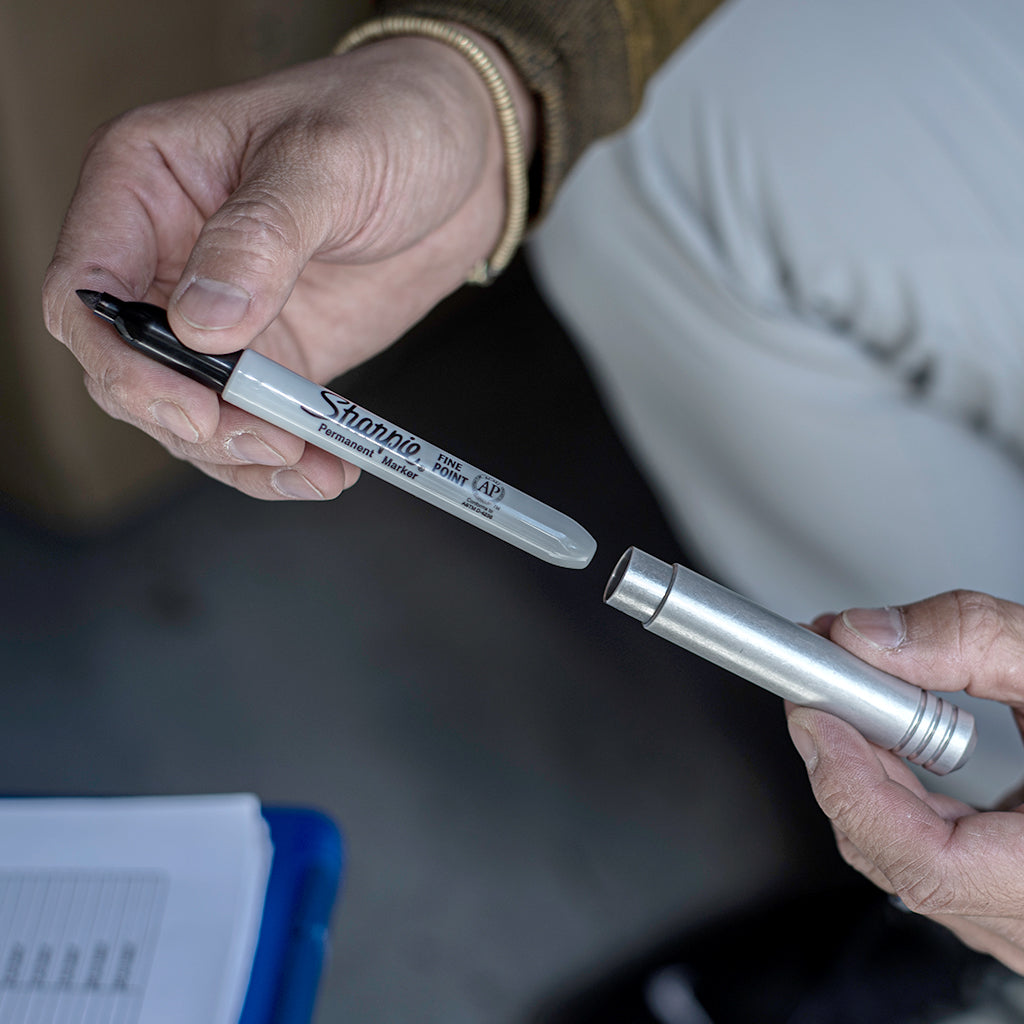 Instructions: Dango Permanent Markers are included with standard fine tipped Sharpie pens. To install the marker, simply insert the bottom end of the Sharpie pen into the marker sleeve and tightly push downwards so that the Sharpie bottoms out in the marker sleeve. Once it is tightly secured, remove the cap of the Sharpie pen, and replace it with the CNC machined Dango Permenent Marker cap. The original sharpie cap can be discarded. To remove the Sharpie Pen, push the pen out from the bottom of the sleeve through the hole with the pointed tip of the cap or a thin object like a pen or allen wrench.