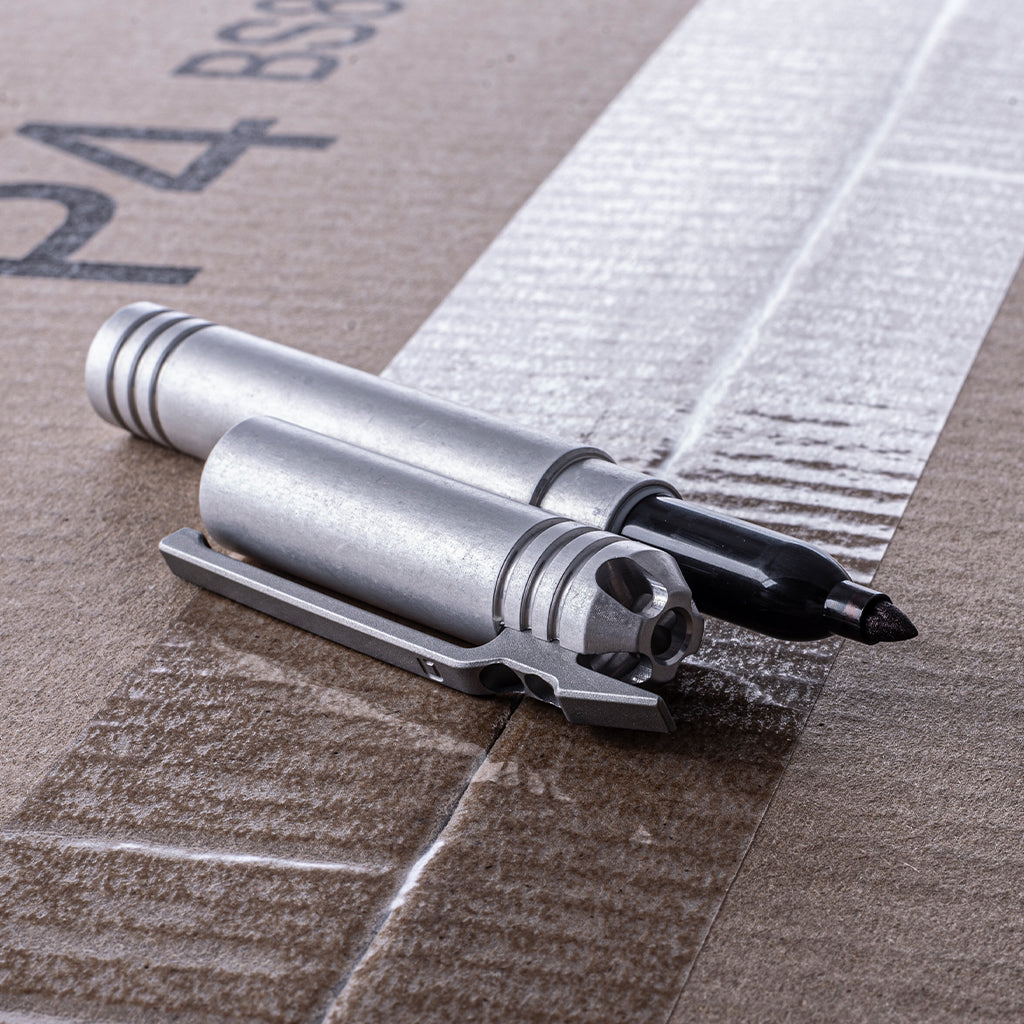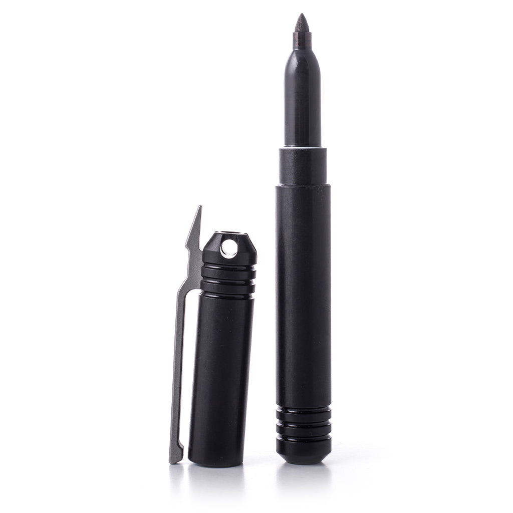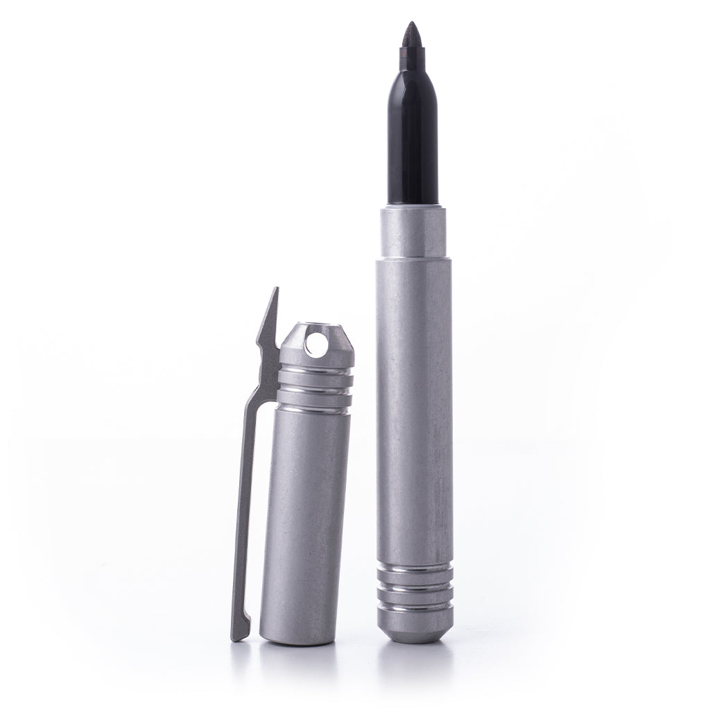 As Dango Products expands into different areas of everyday carry, we identified that writing, marking and drawing are timeless tasks that we perform on a daily basis. The design of the Dango Permanent Marker was derived from our original Dango Pen and Capsule collection. The cap and barrel is CNC Machined out of 6061 aerospace grade aluminum and stainless steel giving the pen a robust and substantial grip with a smooth anodized finish. The cap is equipped with multiple tethering points for hanging. The Dango Permanent Marker comes with the traditional and iconic Sharpie fine tipped felt pen (Sharpie included). Also on the cap is a removable clip/multi-tool that has a pointy edge for box cutting, opening shipment packages and envelopes.