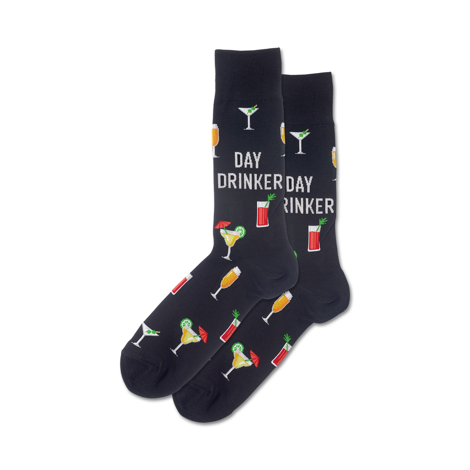 Sip sip, hooray! Dive into a world of refreshing fun with our Day Drinker socks. Featuring a hilarious pattern of party-ready alcoholic beverages printed on a stylish black background, these crew socks will turn your feet into the ultimate cocktail party. From green olives in martini glasses to bubbly champagne flutes and classy red wine glasses, each sock is a celebration of good times waiting to happen. Whether you're hitting the town, kicking back at brunch, or just lounging at home, these Day Drinker socks are sure to bring a smile to your face and a thirst for adventure.
