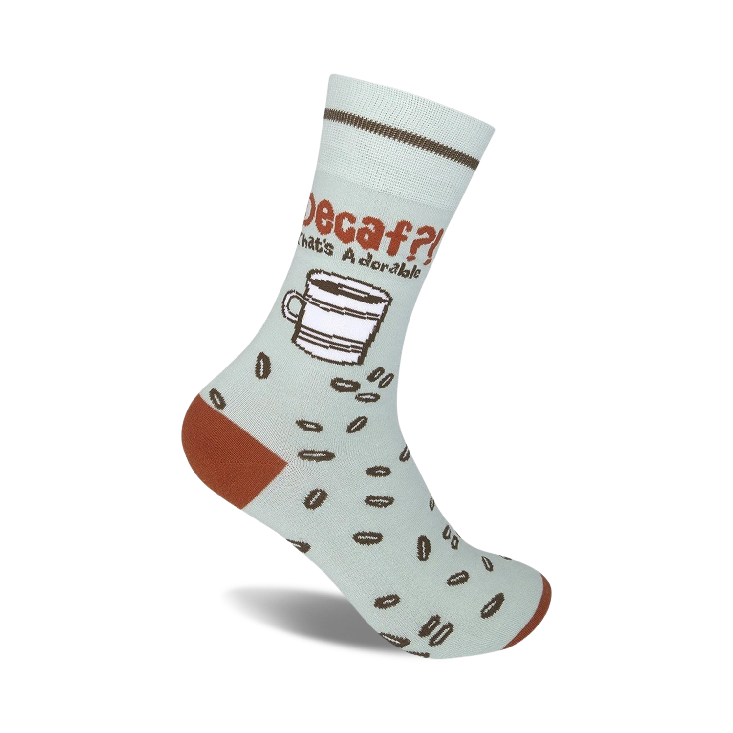 Who needs a cup of joe when you can have a pair of these coffee socks? The light blue crew socks with a brown heel and toe are perfect for coffee lovers. They're made for men and women and feature the words "Decaf? That's Adorable" written on the front in brown text along with a picture of a coffee mug with a coffee bean inside it. There are also coffee beans scattered all over. Show off your love of coffee while keeping your feet comfy in these fun, lighthearted socks.
