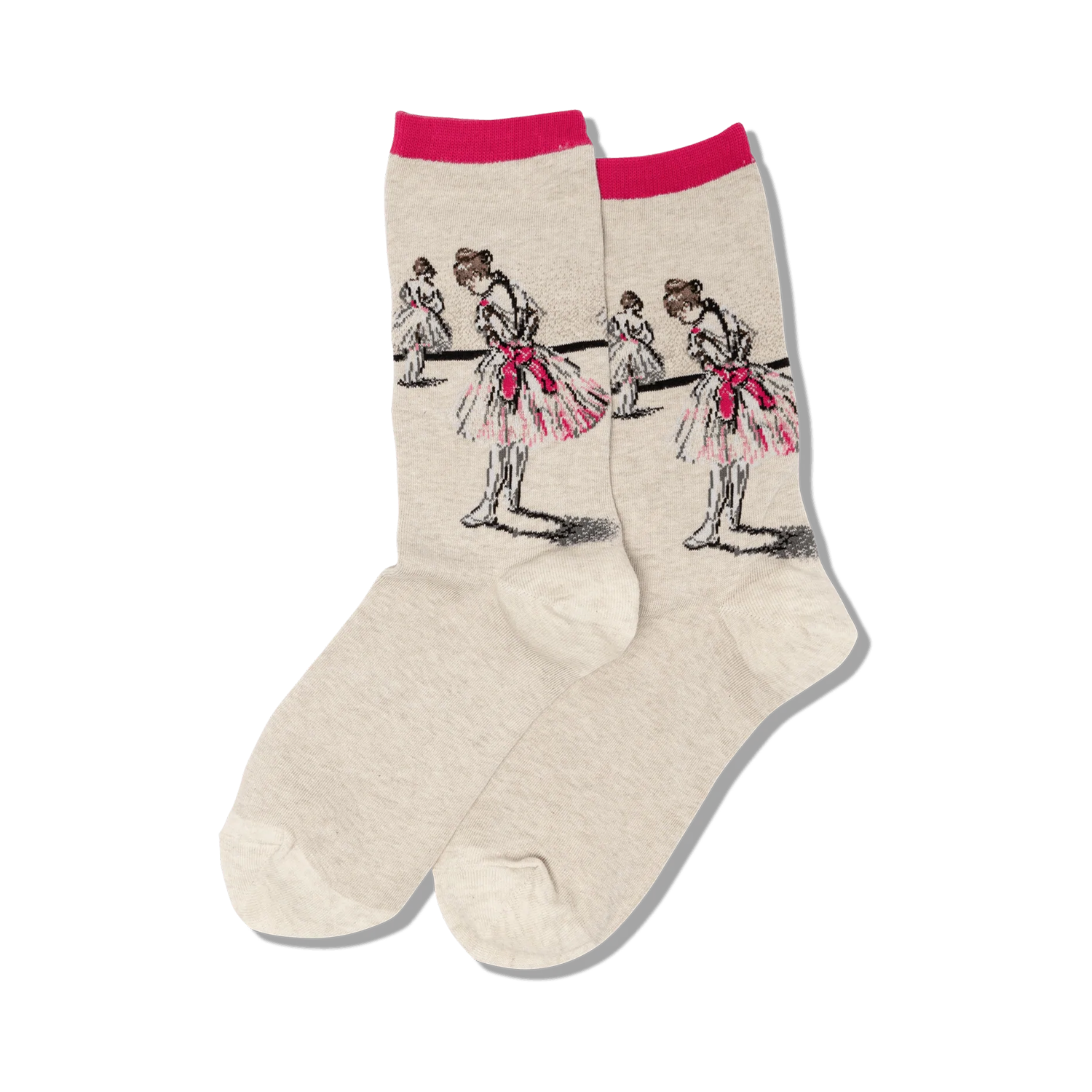 The Impressionist French artist, Edgar Degas, was famously known as the painter of dancing girls. His fascination for ballerinas inspired him to experiment on many types of art mediums. His little dancers often appeared in pencil, pastels, wax, and ink. Now you can enjoy his stunning masterpiece on your feet! These classic socks are perfect for battered, hardworking feet. They are as unique as they are unpretentious. A pair of these cool novelty socks would make the perfect gift for that special someone who dances through life with you.