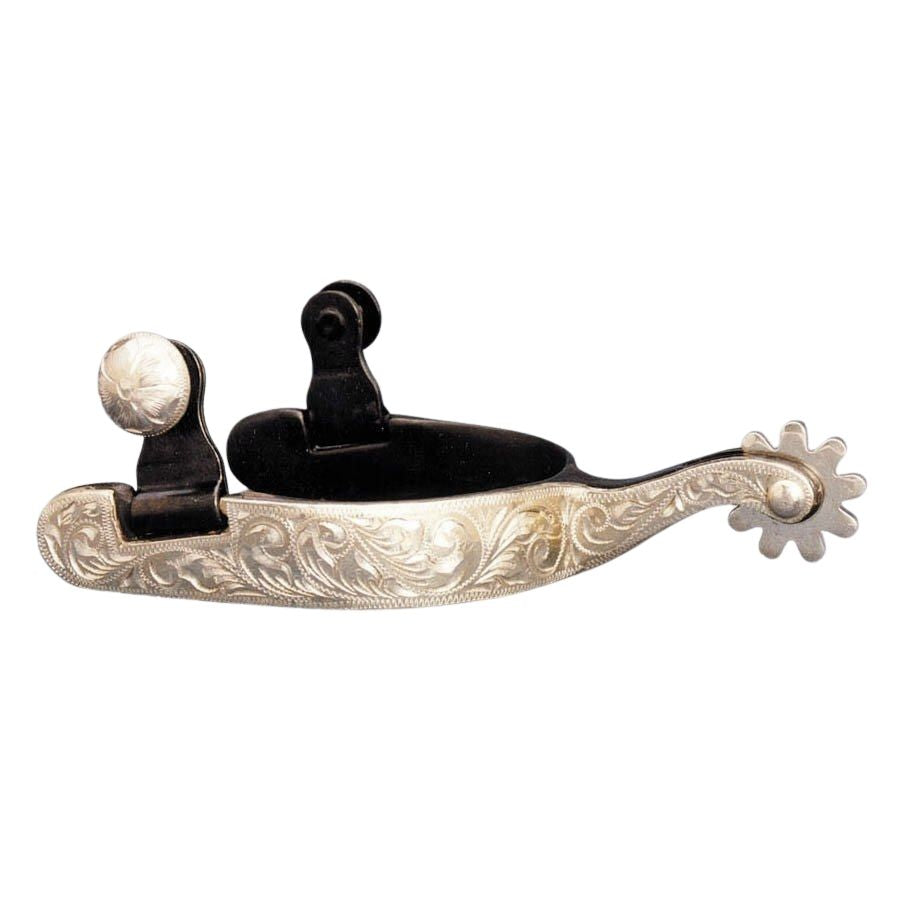 A beautiful pair of black steel spurs with hand engraved nickel silver overlay. 3/4" band, 1 3/4" shank and 1" nine point rowel.