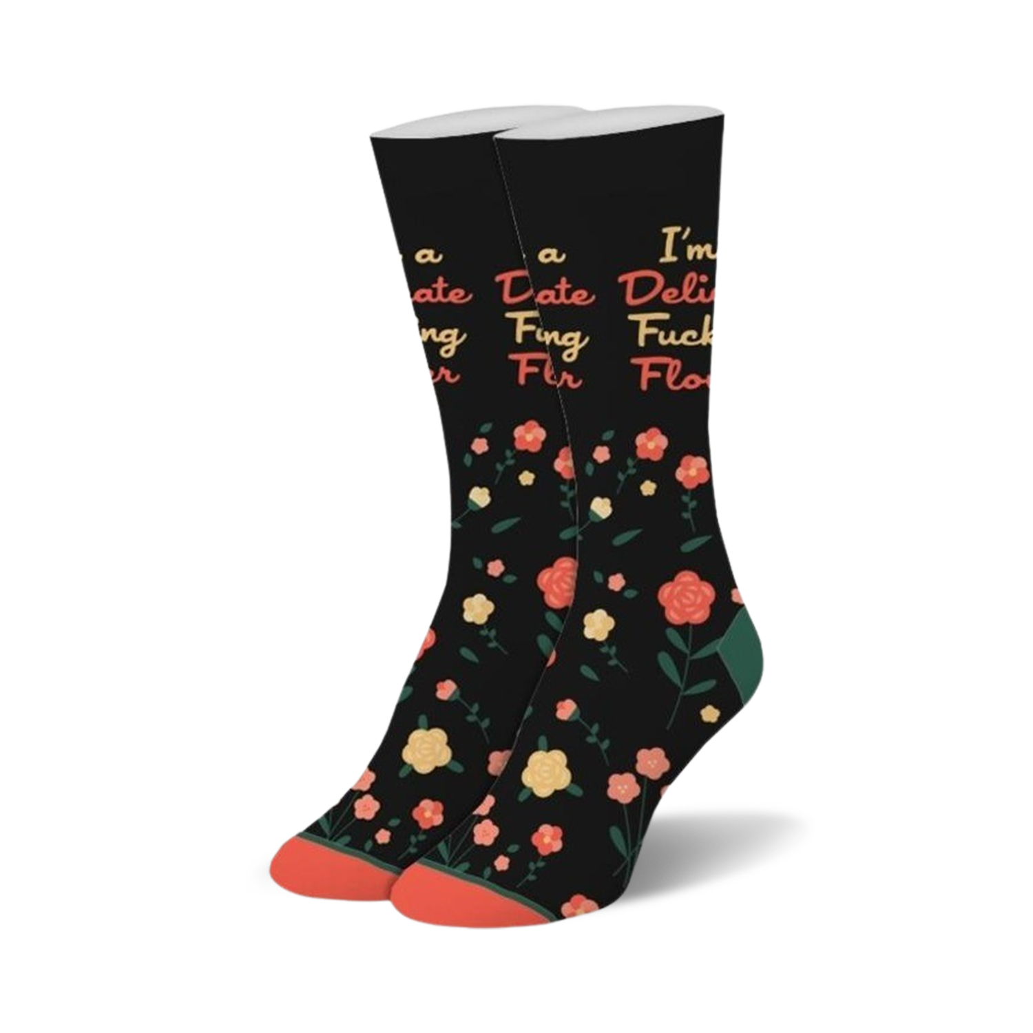Be the delicate fucking flower you were meant to be in our colorful Floral Crew socks. These socks feature an edgy twist with the words "I'm a Delicate Fucking Flower" stitched boldly on the sides. They're the perfect reminder that even the most delicate of creatures can be strong and resilient. Wear them as a fun way to express yourself or as a conversation starter.
