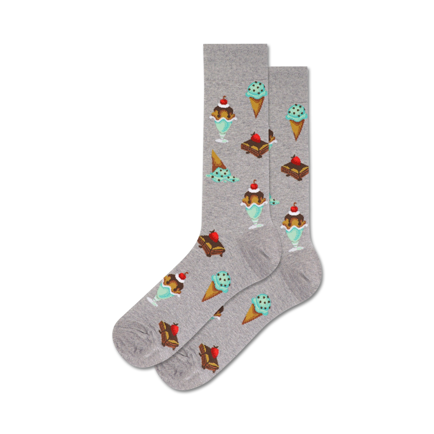 Treat your feet to a sweet escape with our DESSERTS crew socks! These blue socks are covered in a delicious assortment of ice cream cones, sundaes, and brownies that are sure to satisfy your cravings. Whether you're a chocoholic, a sundae enthusiast, or just love a good scoop of ice cream, these socks will make you smile every time you wear them. Bonus: Wearing these socks might just fend off those afternoon sweet cravings!